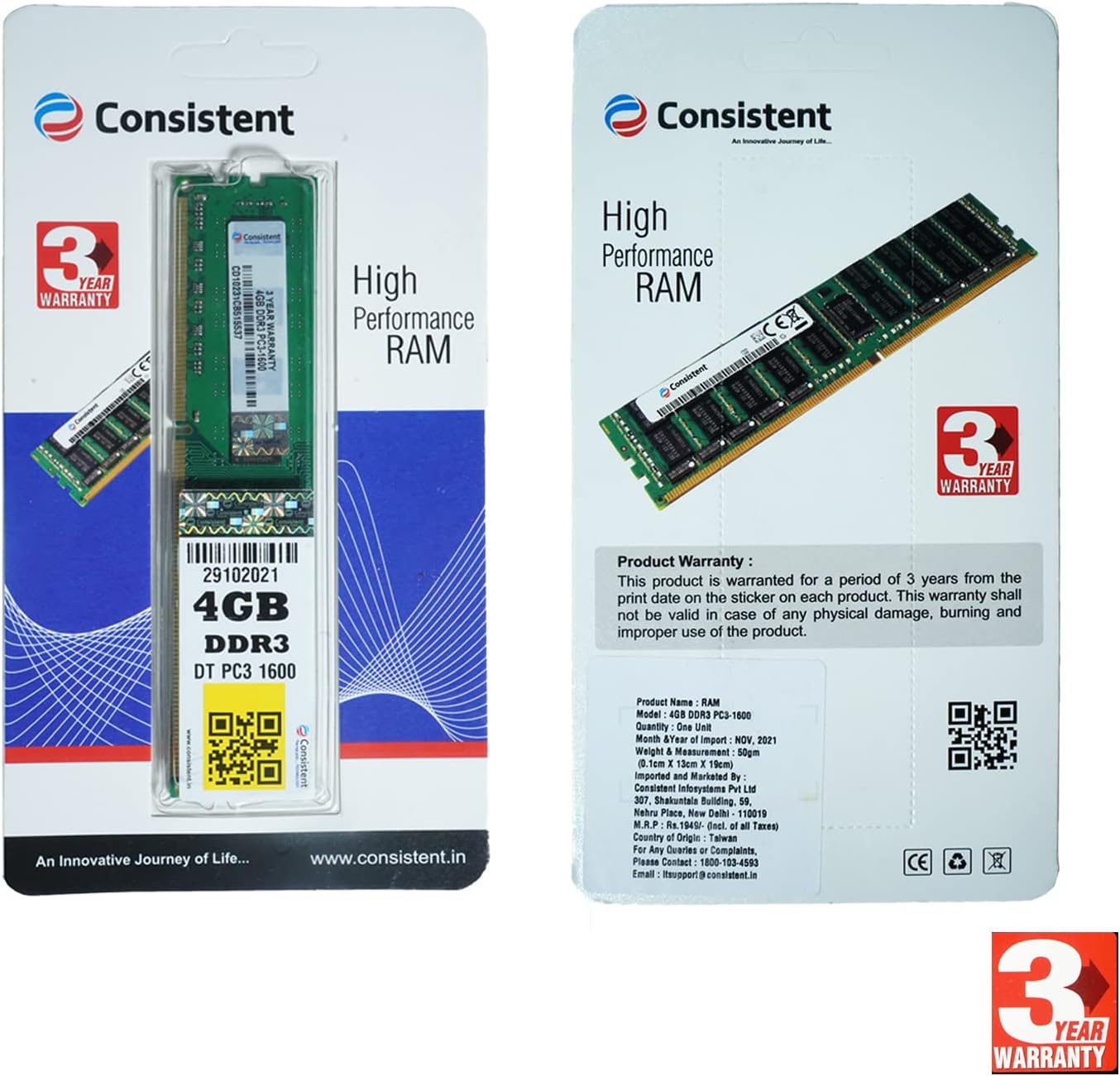 Be the first to review “Consistent – 4GB DDR3 RAM 1600MHz Desktop Memory | | Long-DIMM (UDIMM) | DT PC3-1600| PC3-12800 | for Standard & Gaming Desktop PC with 3 Years Manufacturer Warranty (Made in India)”