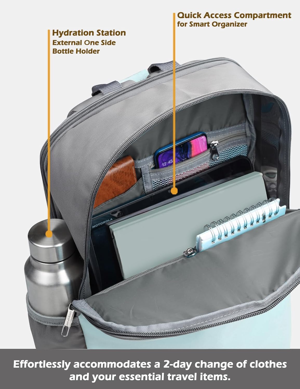 The padded laptop compartment fits upto 14″ laptop. Pass through trolley handle on the back panel helps to secure personal items. The front pocket has multiple level zippered organizers to hold keys, pens, cell phones, a power bank, etc