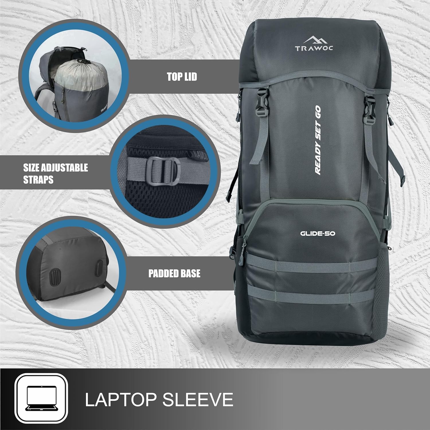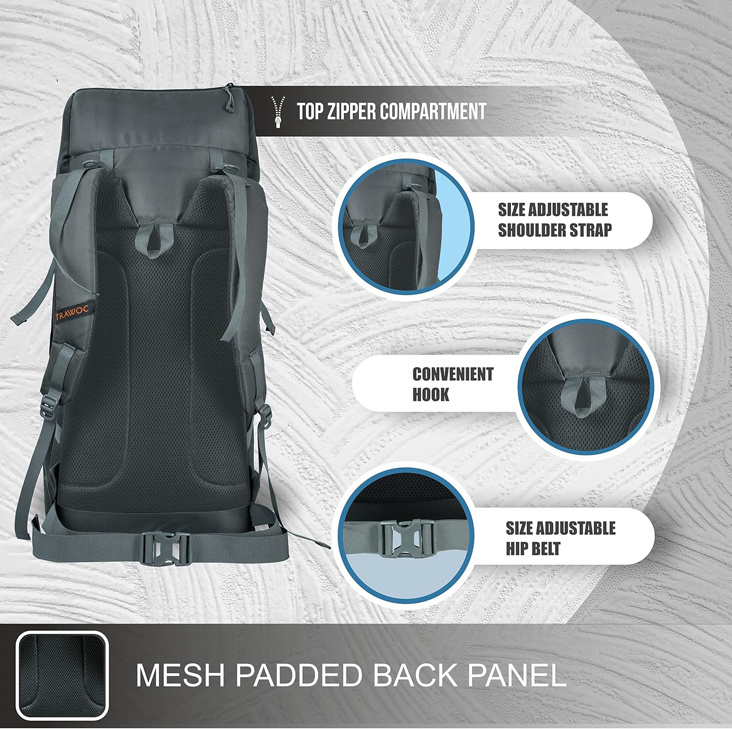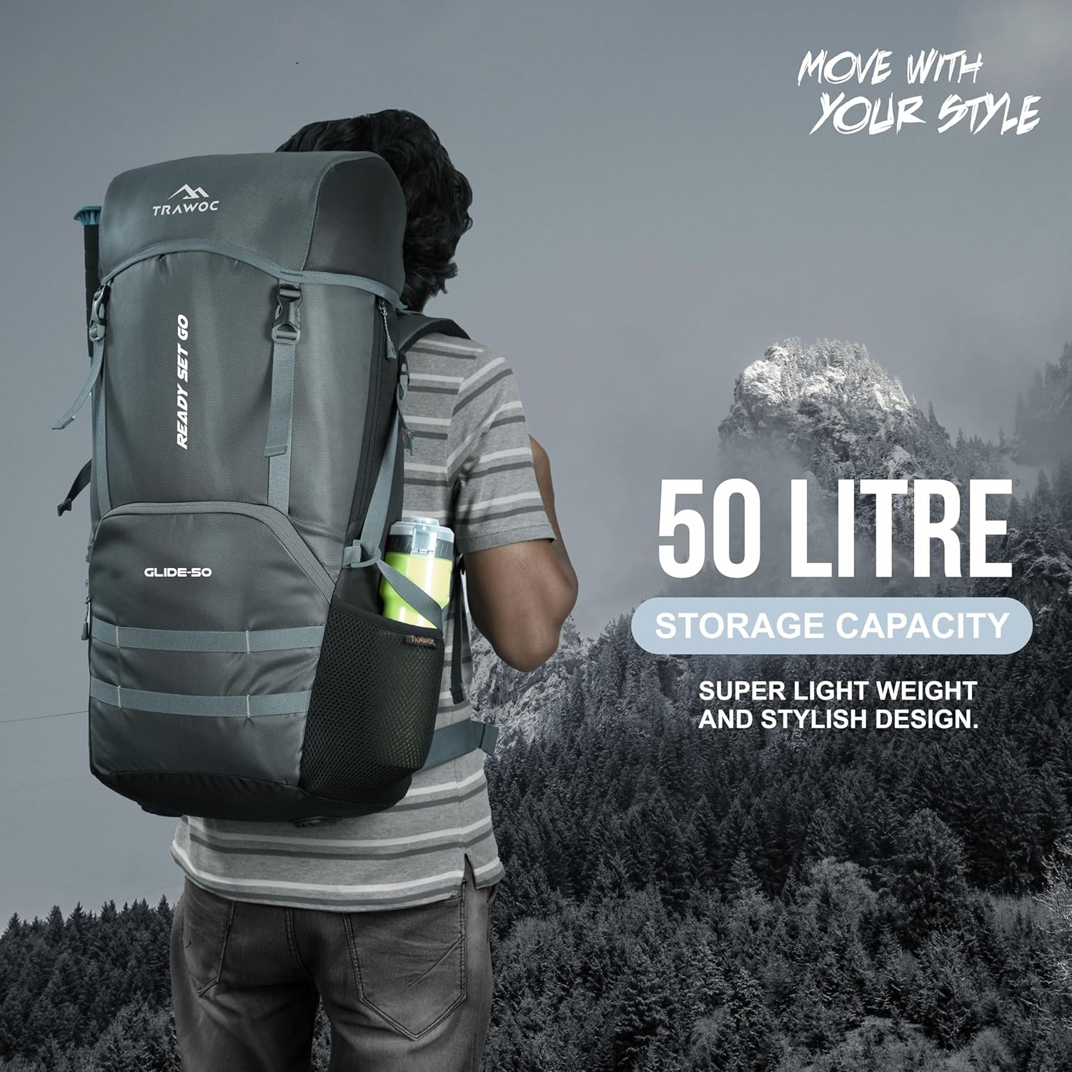 Introducing our Adjustable Trawoc 50 Liter Backpack, the perfect tourister bag for adventurers of all kinds. Crafted from water-resistant rucksack material, this outdoor backpack is your reliable choice for any journey, whether it’s a thrilling hiking expedition, a peaceful camping trip, or city exploration. Designed for both men and women, our backpack ensures comfort and style on your adventures. The 50-liter backpack features side pockets for convenient access to essentials like water bottles and snacks. Its stylish design adds a touch of flair to your travels, making a statement wherever you go. Built to withstand the rigors of travel, our durable backpack includes multiple compartments to keep your belongings organized, including a dedicated laptop compartment for tech-savvy travelers. It’s the ideal backpack for trips of all sorts, ensuring you stay comfortable and organized throughout your journey. For avid hikers, our hiking rucksack offers extra comfort and ample pockets for your gear. The travel backpack is equally at home in the great outdoors and urban settings, providing flexibility and functionality. The 50 ltr trekking backpack is a dependable companion for your wilderness explorations, while our camping backpack is tailored for nature enthusiasts. This versatile rucksack is thoughtfully designed for both men and women, ensuring everyone can enjoy its benefits. With a 50l capacity, it’s perfect for mountain enthusiasts and long trips. Whether you’re a boy or a girl, our travel bag offers durability, style, and ample space for your essentials. No need to worry about unpredictable weather with our water-resistant rucksack, and the generous capacity ensures you’re prepared for any adventure.