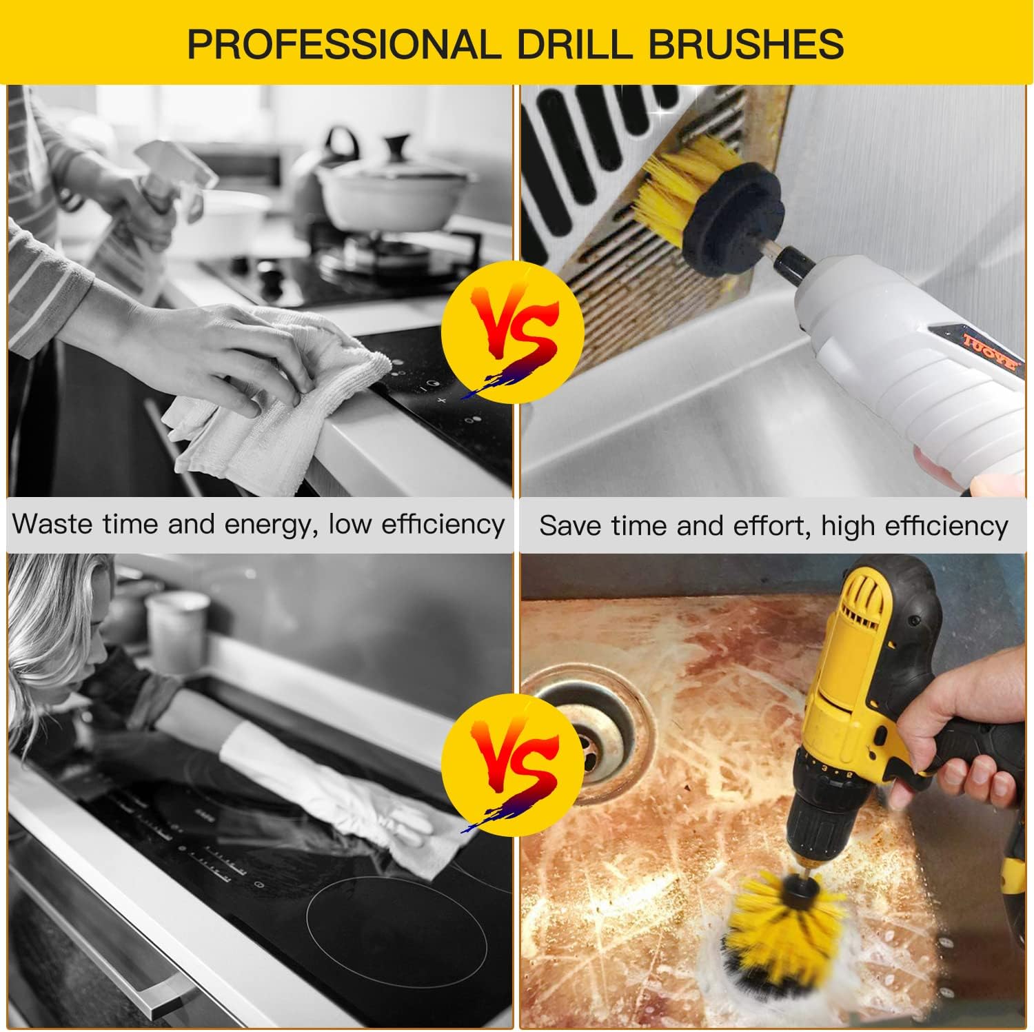 [ALL SPOTS AND SURFACES]— The Drill Brush Accessory Kit Is Used With Typical Household Cleaners, Suitable For Carpet Mats, Cleaning Pool Tiles, Bathrooms, Showers, Car Tires, Sinks, Ceramics, Stoves, Oven Interiors, And Stubbornness In Porcelain Stains, Dirt, Mud, Unsightly Grout, Light Rust And Any Other Dirt on Tile Surfaces, Kitchen Stoves, Floors And Vehicles.