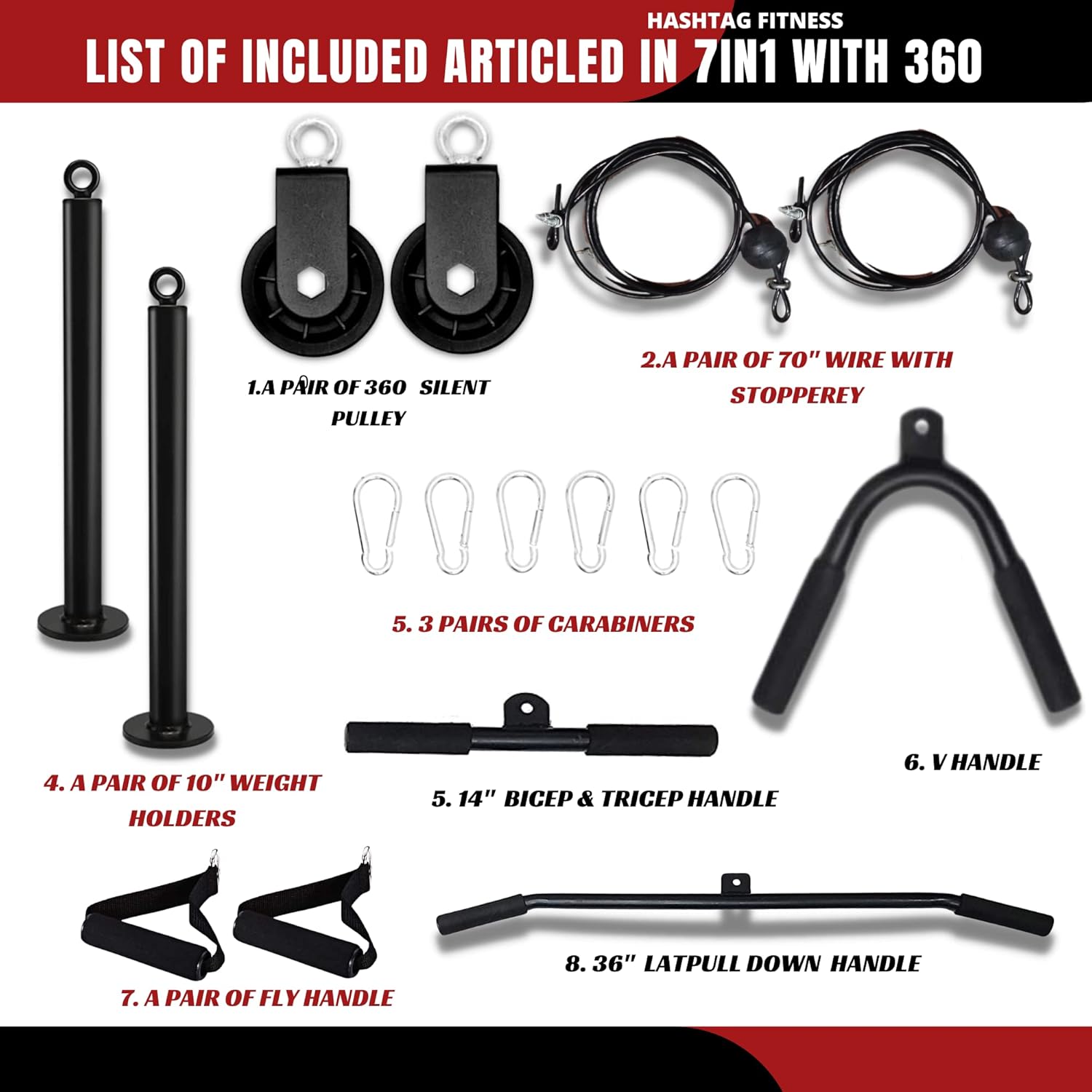 The Hashtag Fitness 7in1 multi pull up bar for home dip station,dip stand,Lat Pulley System kit has 2 pulleys and more cable machine accessories than others gym pulley system sets, allowing you to flexible DIY and choose your own way to do various exercises, such as Biceps Curl, Triceps Pull Down, Lat PullDown, Row, Fly and a perfect gym equipment set for home workout.