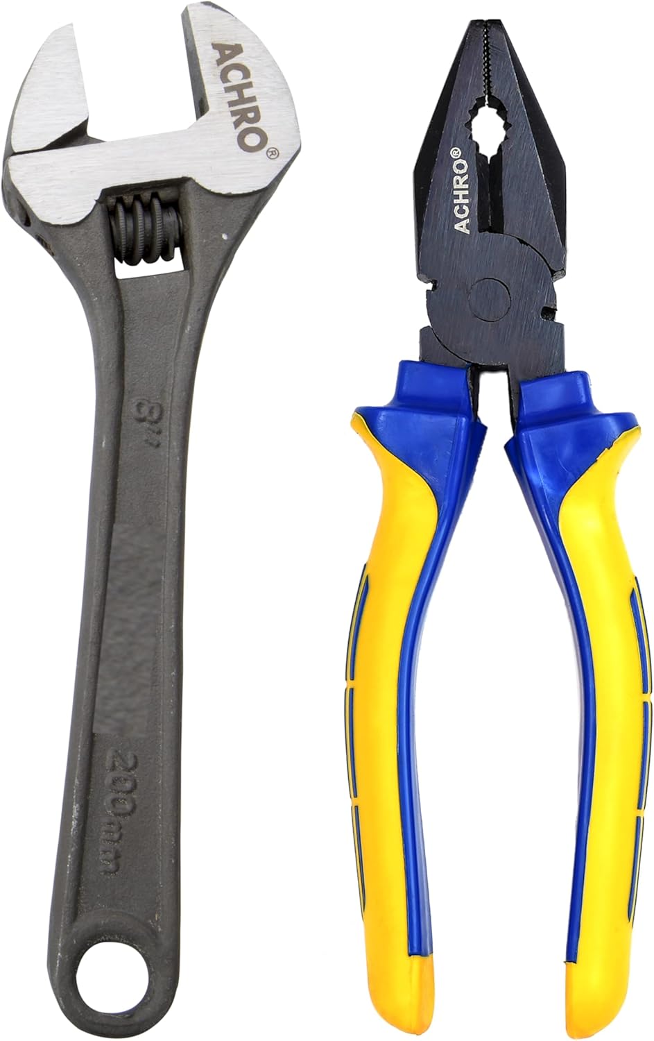 ACHRO brings you pack of 2 pcs tool kit Chrome Steel Adjustable Spanner 8 Inch and 8 inch plier tool (Max Opening: 25 mm) with excellent quality and precision that allows access you to reach previously impossible to reach areas. Made from high grade forging quality steel and heat treated in the range of 40 to 50 HRC, to give you long and trouble free service, Forged chrome vanadium steel is strong and durable.