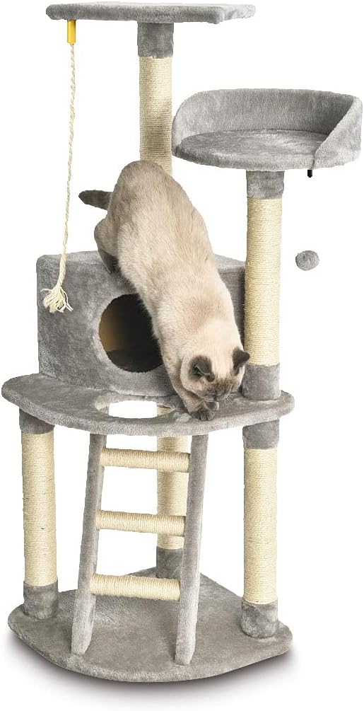 Amazon Basics Cat Condo Tree Tower With Scratching Post And Step Ladder – 19 x 19 x 52 Inches, Light Grey