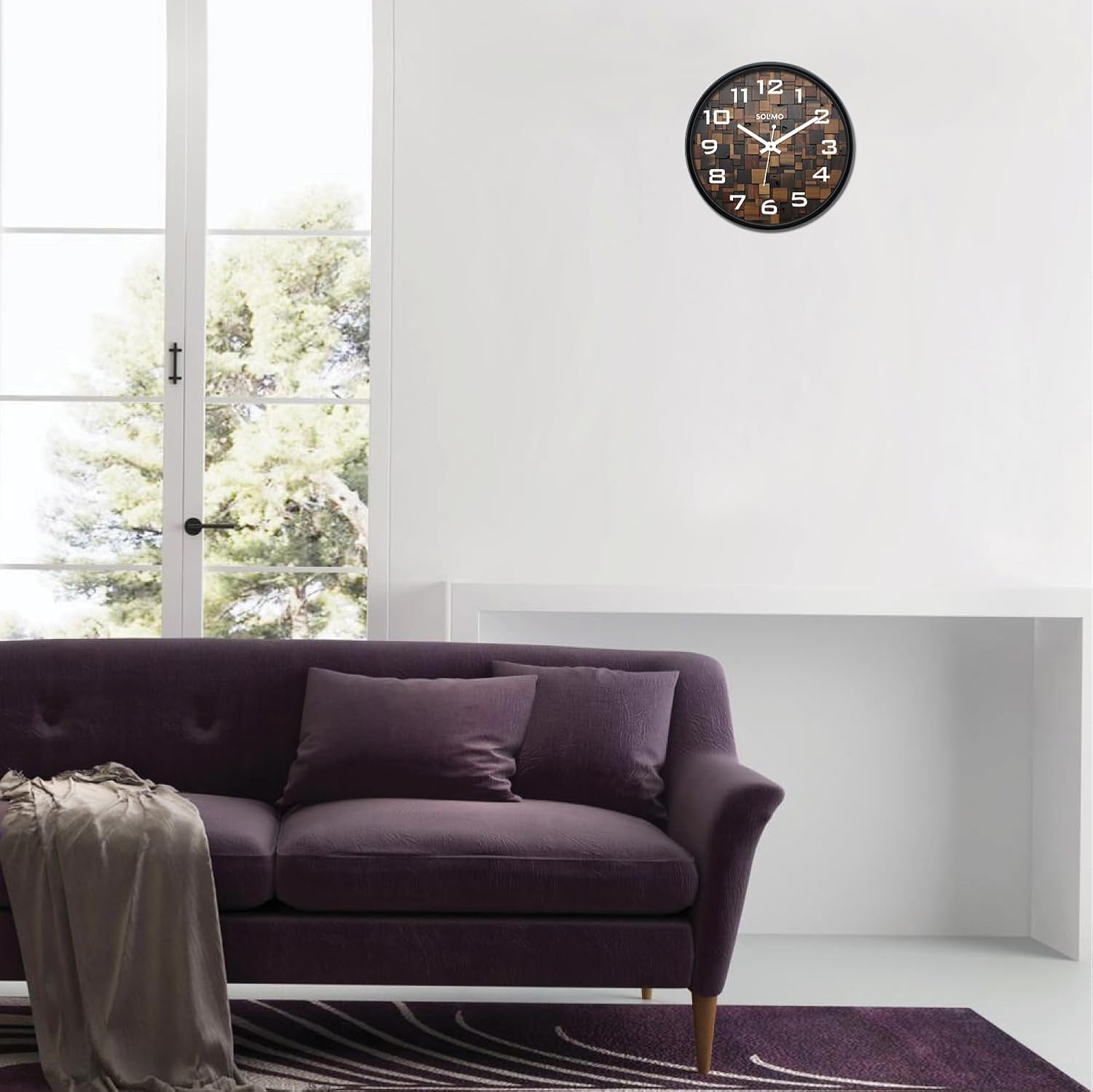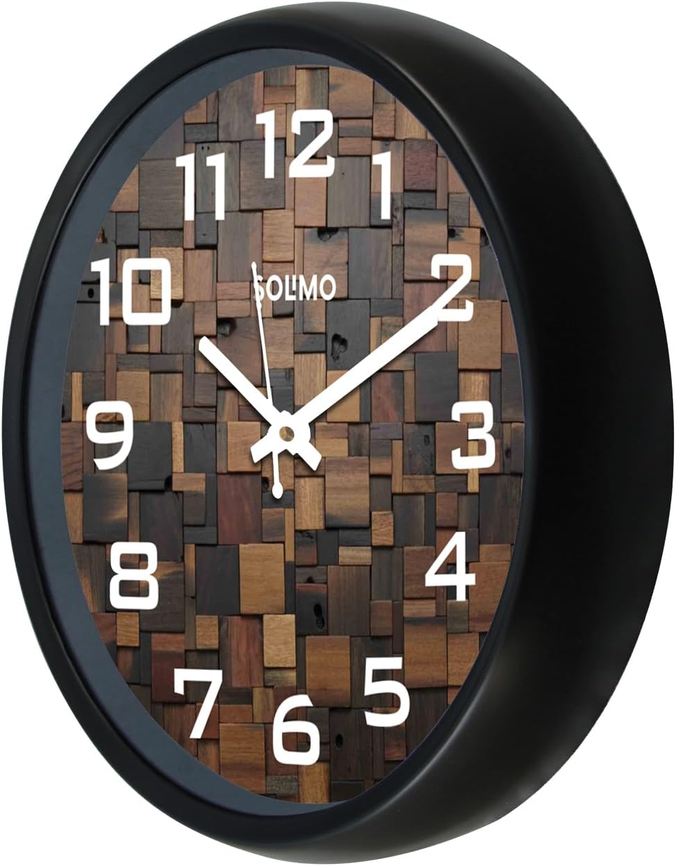 Amazon Brand – Solimo Round Plastic & Glass Wall Clock, Wood Craft (Silent Movement), 12 inch, Black