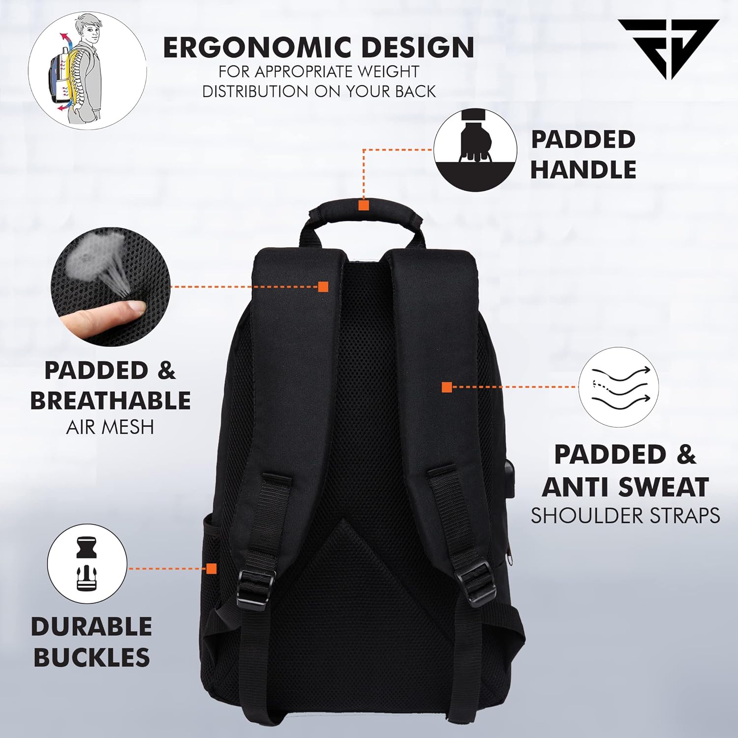 Ergonomic Design: This backpack has been designed to ensure equal weight distribution on your shoulders along with padded shoulder straps and breathable air mesh on the back.