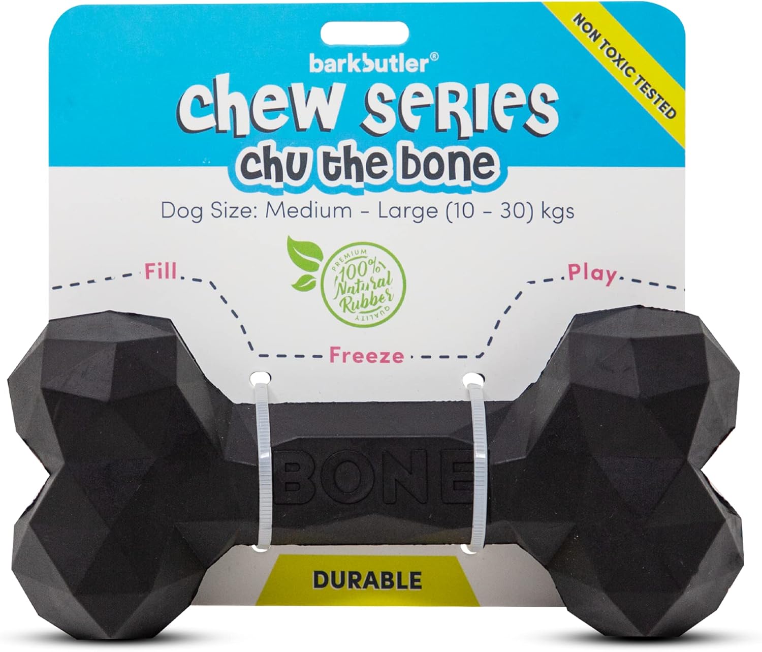 Barkbutler’s Chew Series presents, Chu The Bone – A 100% natural rubber, non-toxic tested & premium quality bone. It is super durable and can hold Jerkies, peanut butter & some biscuits. Designed for strong chewers and it’s diamond-cut pattern aids teeth cleaning. Playing Styles: Treat dispensing, Fetch, Tug, Tough Chewing. Chu the bone works best with Medium-sized dogs (10-20 kg). Instructions – Fill Dahi, peanut butter and freeze for one hour. Serve to your pup and keep them busy.