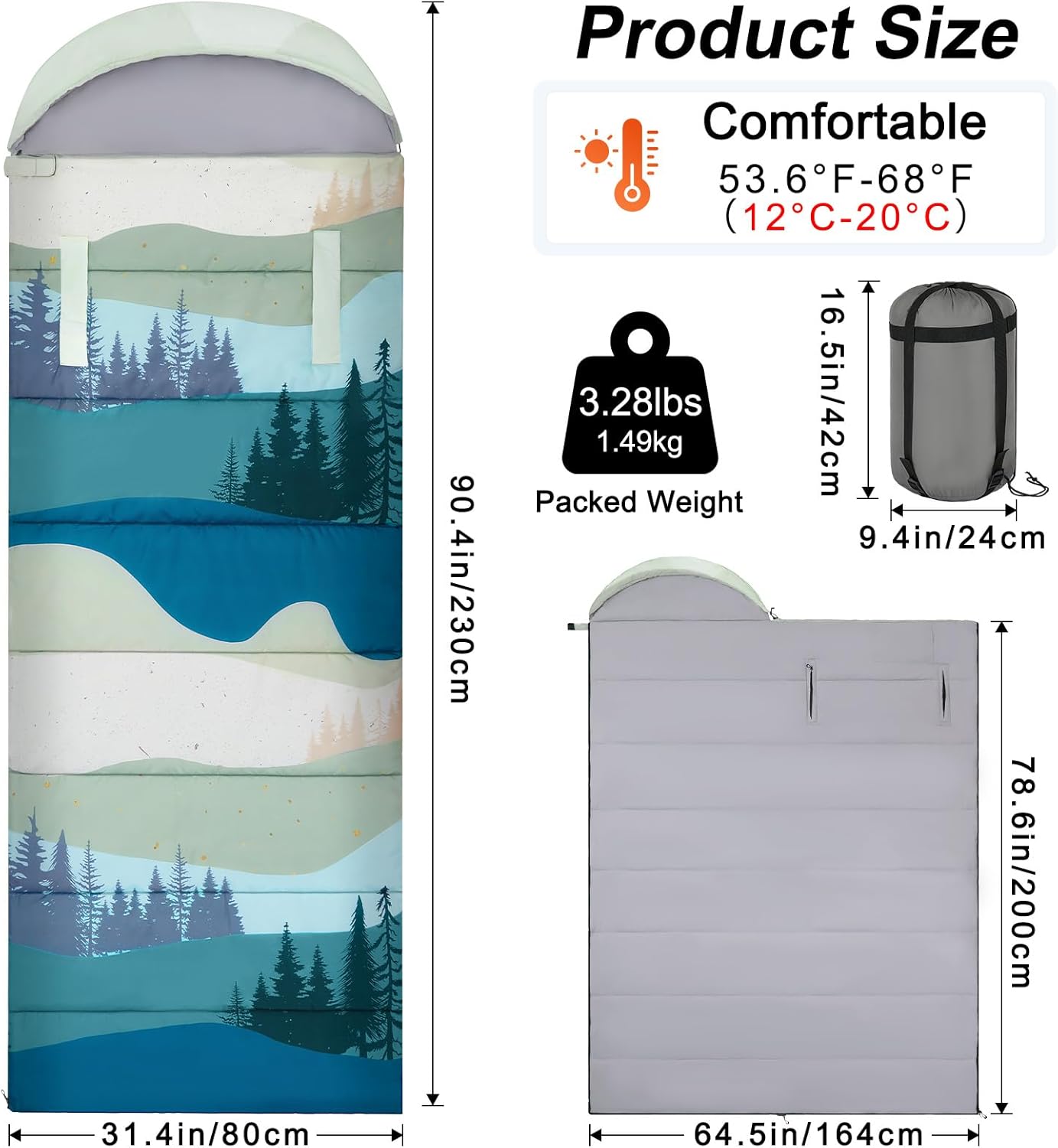 Size: Measuring 90.4*31.4 inches, this adults sleeping bags offer plenty of space for adults and is suitable for 3 seasons, comfort in temperatures ranging from 53.6°F to 68°F (12°C to 20°C), Ideal for indoor outdoor camping, hiking, and backpacking