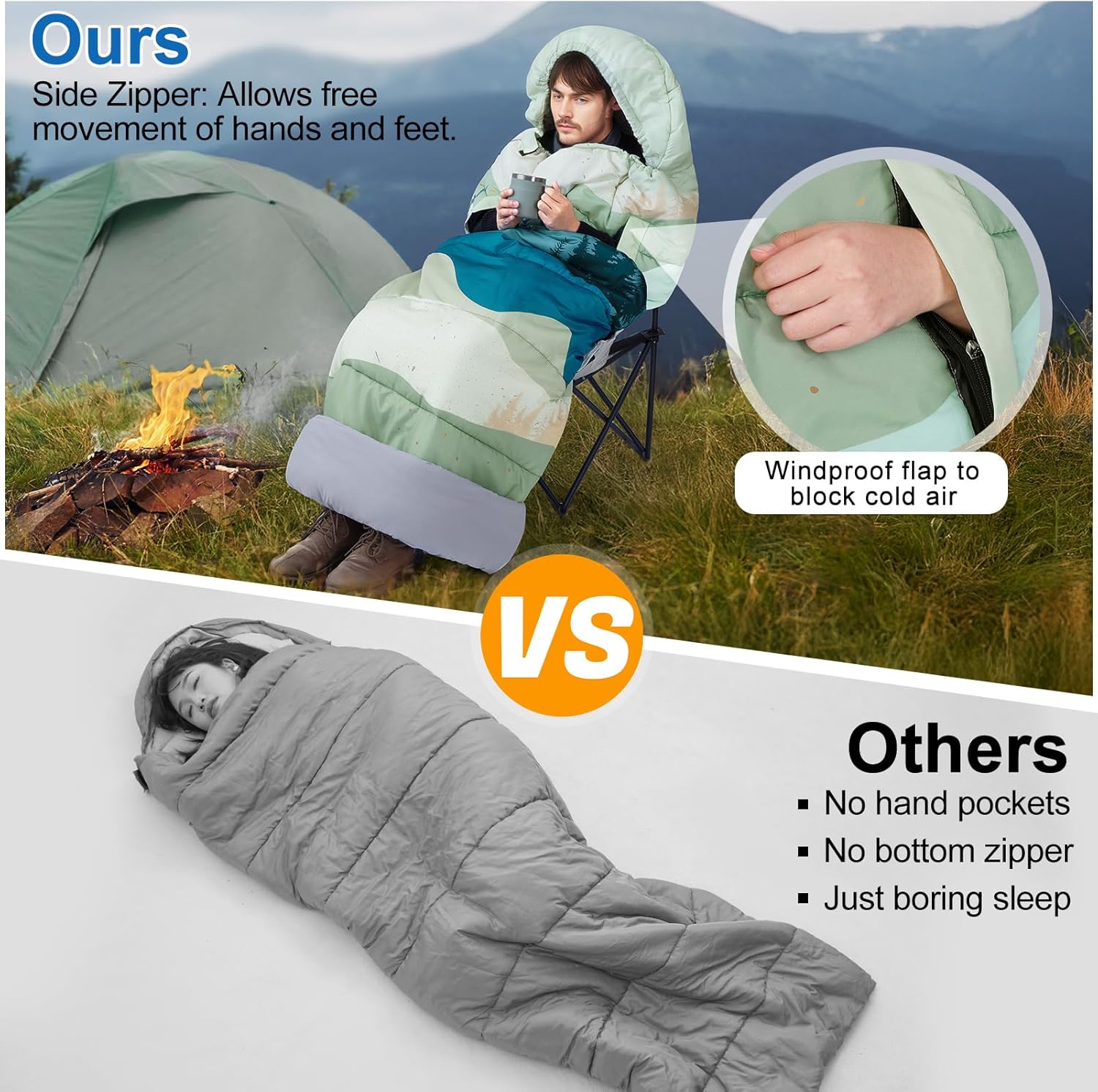 Hand-out Design Sleeping Bag: Our adult sleeping bags feature a unique hand-out design, allowing you to move your arms freely without removing the bag, equipped with a windproof flap to keep out the wind, keeping you warm and comfortable