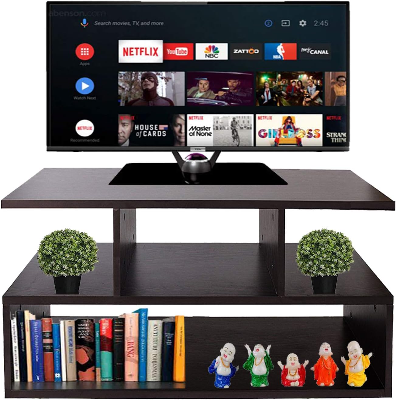 The TV stand comfortably accommodates your set-top box, DVD player and external speakers, the shelves are large enough to accommodate your media collection, decorative items, books, etc