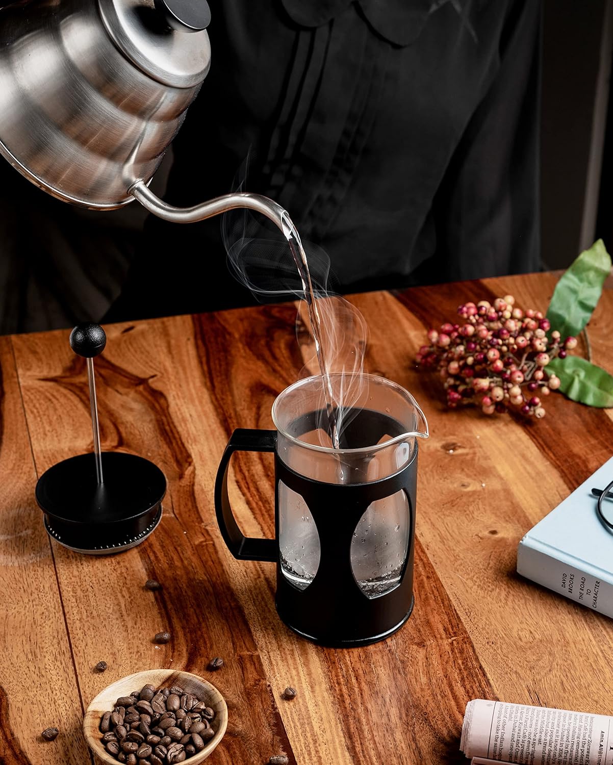 PREMIUM QUALITY: French press coffee plunger is made from premium grade stainless steel and the heat resistant borosilicate glass carafe, and the easy-to-pour drip-free spout is made to withstand and retain boiling water temperatures.