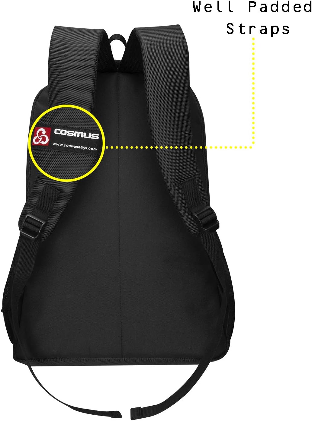 Stylish and Durable for Everyday Use Cosmus Darwin 15.6 inch laptop backpack is made of High grade water resistance PU coated polyester material that gives it strength and makes it durable for long-term use. It features a zippered well-padded Laptop compartment that fits upto 15.6 inch laptop, middle compartment is big enough to hold your office or daily use belongings, it also has two front zippered pockets with an office organizer, you can use it to store the charger, mouse, pen drive, notepad, pen and other essentials. Cosmus Darwin backpack features two mesh side pockets, where you can keep your water bottle or any other item for an quick access. Waterproof Laptop Backpack Bag Cosmus Darwin laptop backpack is perfect laptop bag for you, its cushioned laptop pocket keep your laptop securely tight and protected while you are on the move. This laptop bag pack suits your style & is very comfortable to carry, its ergonomics and makes you forget the load you are carrying, well-padded shoulder straps ease the carrying Colour: Black Material: Polyester Compartments & Pockets: Two main compartment, Two front Pocket, Two side mesh pockets Compatible laptop Size: Upto 15.6 inches