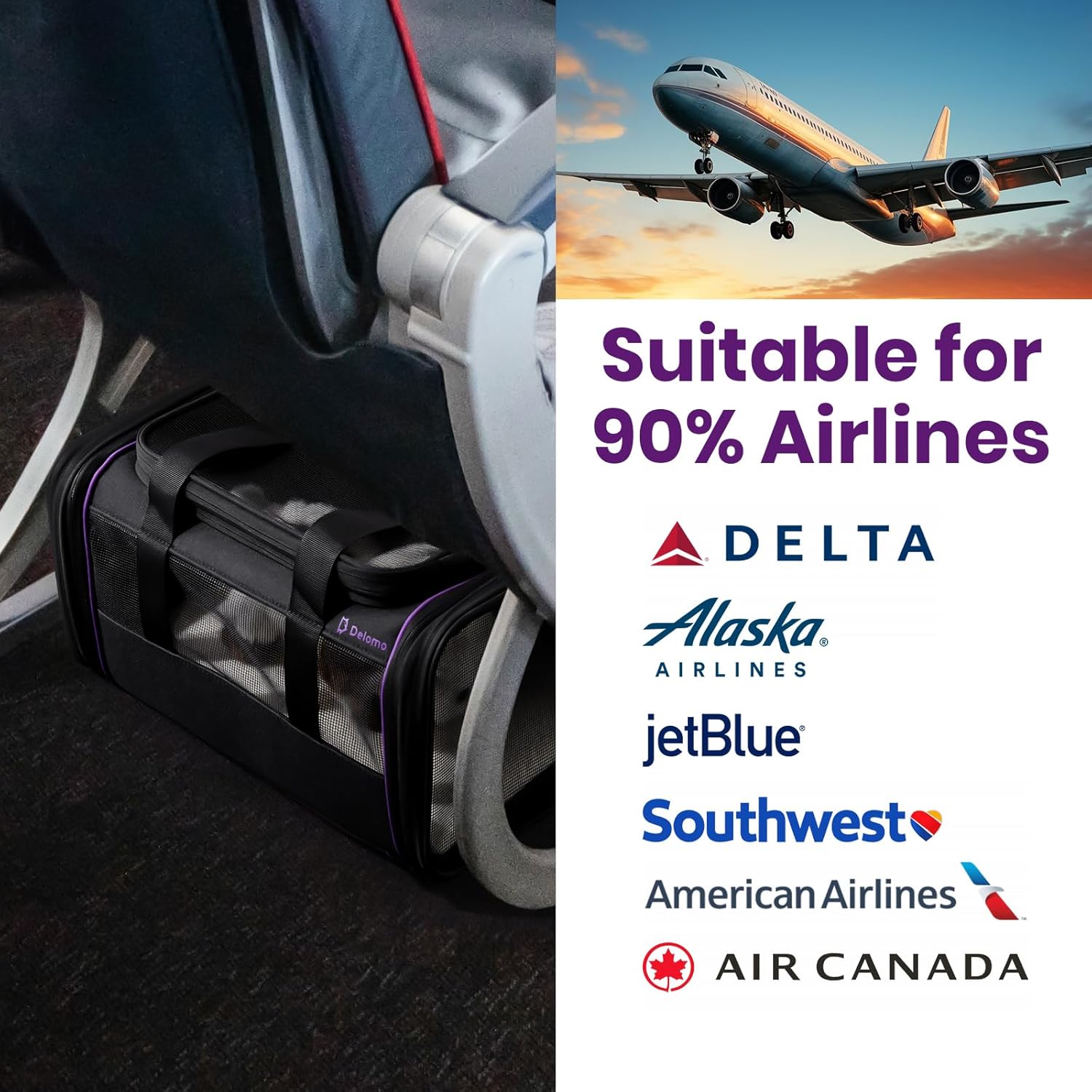 Airline Approved Comfort: Designed for compatibility with 90% of airlines, the DELOMO pet carrier makes traveling with your pet simple.Approved by Delta, Spirit, United, Alaska Airlines, JetBlue, American Airlines, Southwest, Air Canada, Frontier, Allegiant Air, Envoy Air, and SkyWest Airlines.