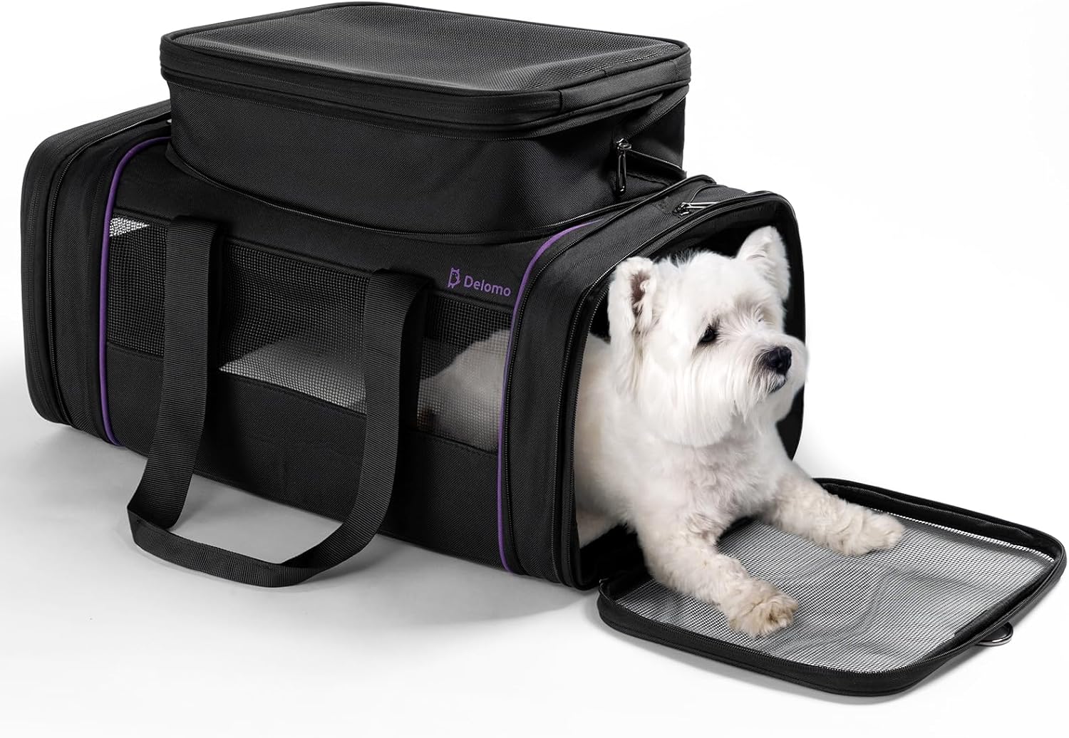 DELOMO Pet Carrier – Airline Approved Cat and Dog Carrier for Small Dogs, Small Cats up to 15 Lbs – Durable Dog Travel Bag, Expandable, Comfortable, Fits Major Airlines (17″ x 11″ x 8.6″)