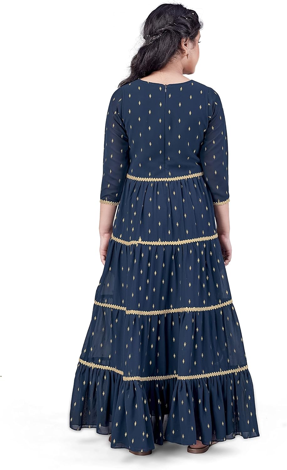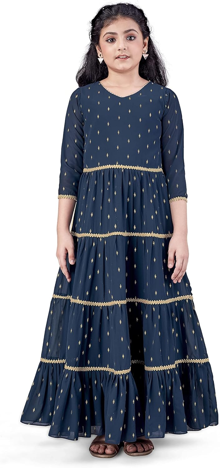 Spruce up your girl’s wardrobe with this rust color maxi dress from Fashion Dream on Amazon. This readymade maxi dress is perfect for a day out with friends or night of get-togethers with family. Pair it with fancy accessories to make your look more beautiful. This ankle length maxi dress is suitable for wedding, party, festival and give rich and classy look! This gorgeous girl’s readymade party wear long maxi dress gown is made of taffeta fabric with butter crepe lining material. This long maxi girls dress features a keyhole neck, 3/4th sleeves, cancan, ankle length, self-fabric belt and zip closure at backside for perfect fitting. There is a beautiful foil print pattern overall the dress that makes more adorable to this attire.