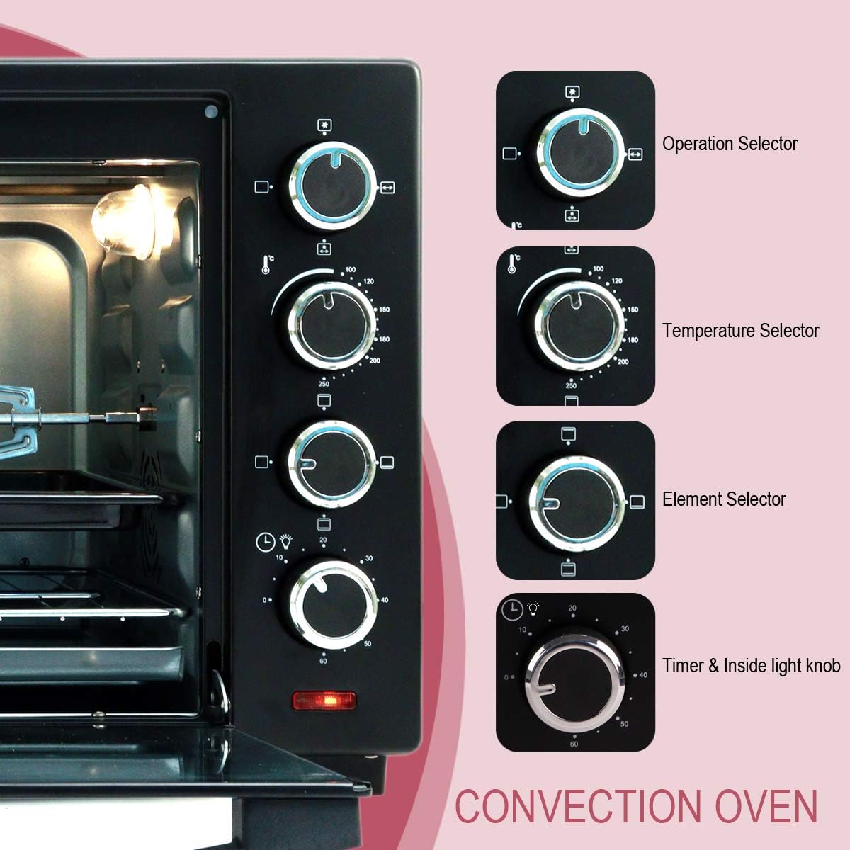 Rotisserie : A rotisserie oven keeps meat turning constantly and the meat get cooks evenly. Plus, it is much healthier to cook in this oven, since it drains all the unhealthy fat from the meat.