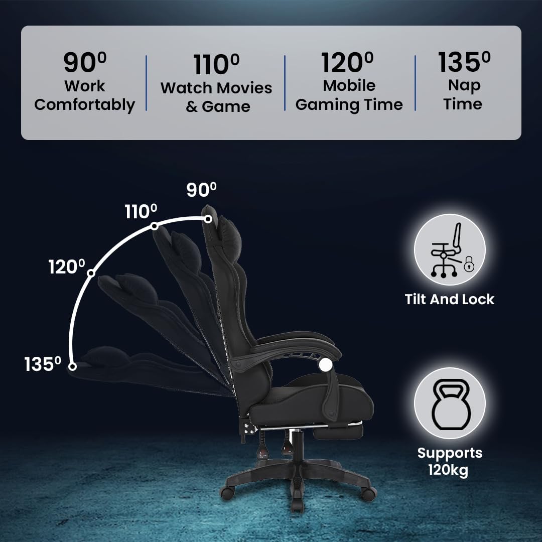 KOZEN Sniper Gaming Chair with Adjustable Headrest & Lumbar Support,135° Recliner Chair | Stretchable Armrest with Footrest, Multifunctional Chair, Blue (Black)