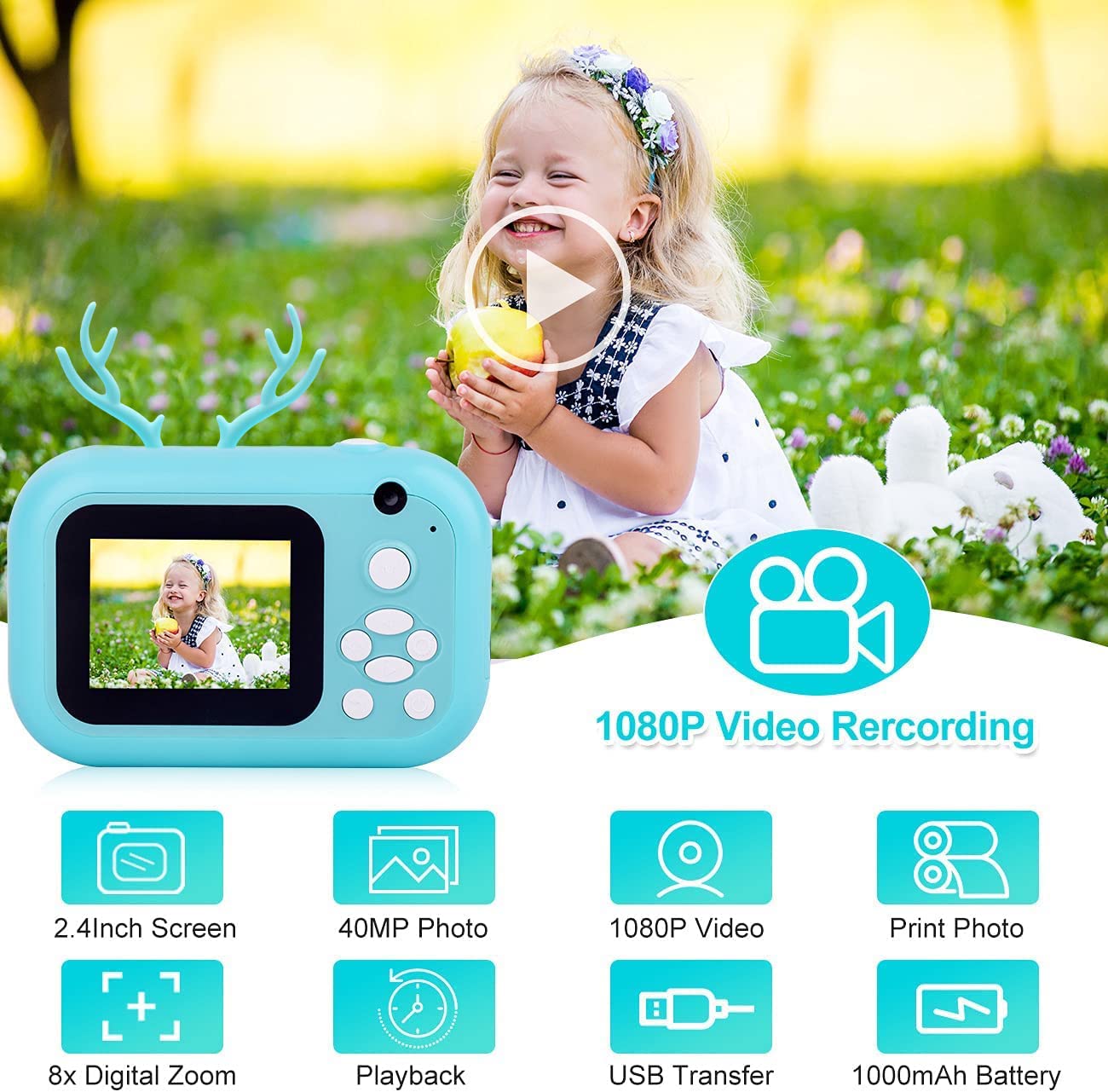 40 MEGA PIXELS & 1080P HD VIDEO: Digital camera for kids has dual cameras, selfie supporting. The front and rear are both 40 mega pixels. kids digital camera with 8X digital zoom that can zoom in to take photos. Child camera comes with 20 funny photos frames. Support date setting. Children digital camera provide playback sound for the videos it records