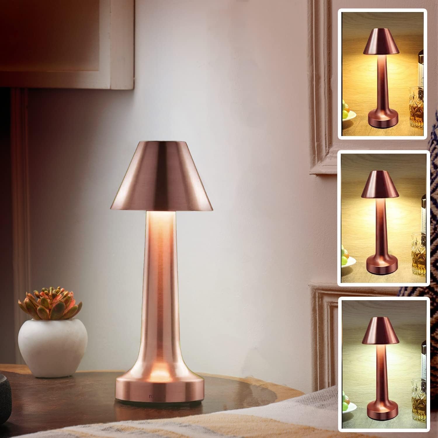 Metal LED Desk Cone Lamp Comes with Touch Sensor, 3-Levels Brightness, USB Rechargeable Cozy Warm Lighting – Ideal Bedside Lamp, Night Light for Kids Nursery, Dining Room (Rose Gold)