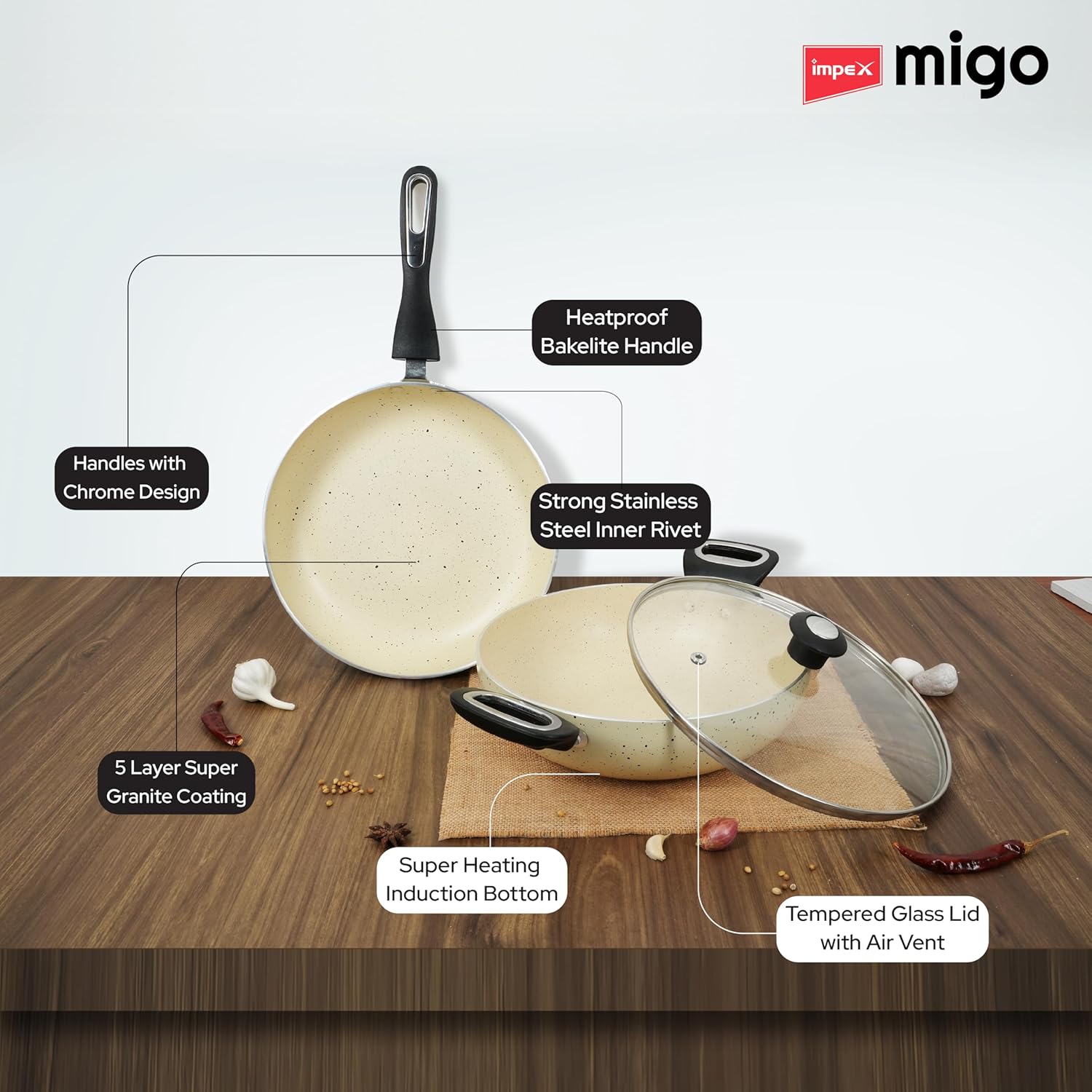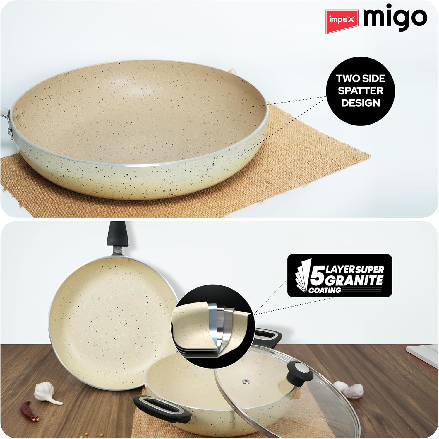 Impex Non-Stick Cookware Set designed to revolutionize your cooking experience. This set includes a versatile fry pan and a spacious kadai pan, With a durable glass lid for added convenience. This kitchen cookware set is made of 5-layer super granite coating, these pans boast a non-stick surface that’s 10 times tougher than standard coatings, ensuring effortless cooking and easy cleanup every time. Not only are these pans exceptionally tough, but they’re also incredibly versatile. Compatible with both gas and induction cooktops, they’re ready to adapt to any kitchen setup. Plus, rest assured knowing that our cookware is PFOA-free, prioritizing your health and safety. Constructed with a sturdy 3mm thickness, these pans offer optimal heat distribution for consistent cooking results. The chrome-plated detachable handle and knob provide a secure grip while allowing for convenient storage and cleaning. We stand behind the quality of our product, which is why we’re offering a generous 1-year replacement warranty. Elevate your culinary adventures with our Non-Stick Cookware Set, where durability, versatility, and convenience converge to redefine your cooking experience.
