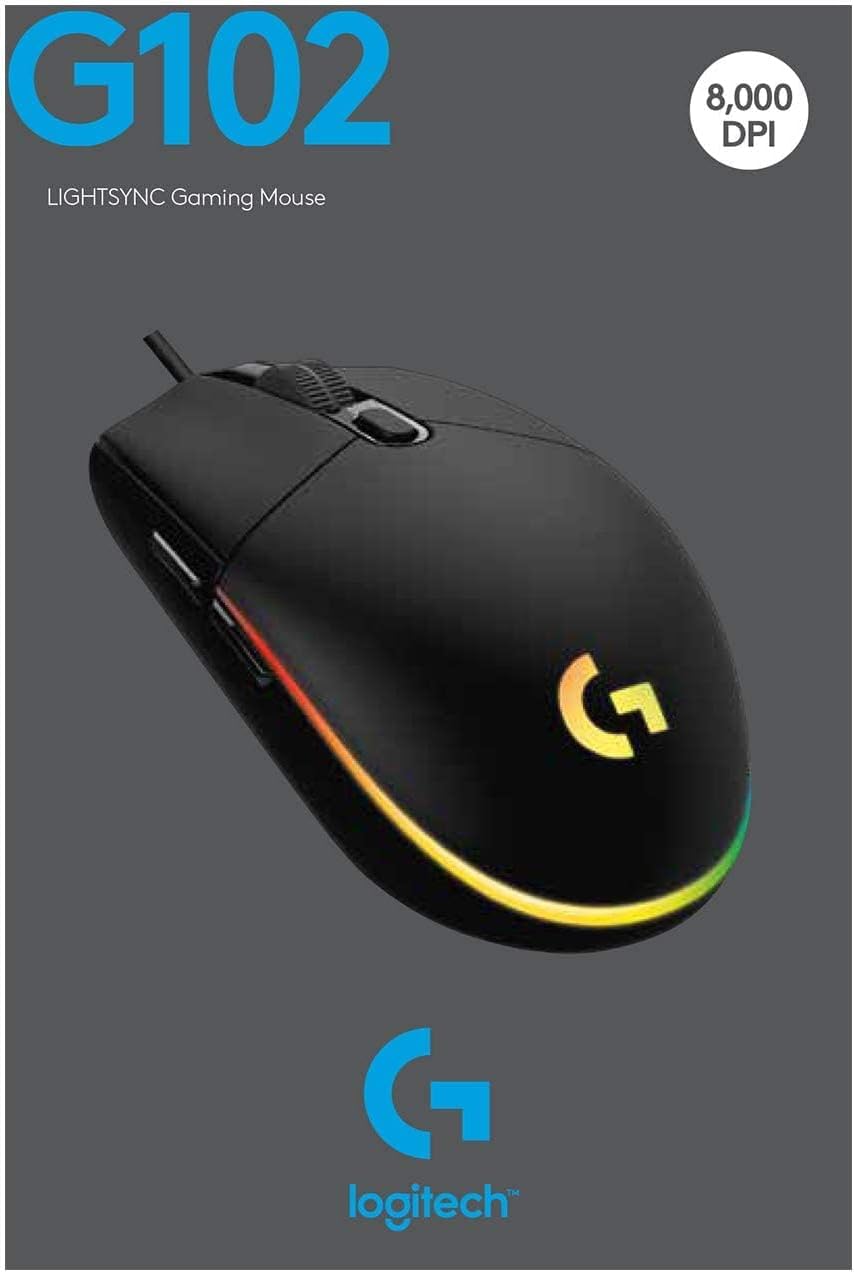 “G102 LIGHTSYNC is ready to play with an 8,000 DPI sensor and customizable, vibrant LIGHTSYNC RGB. LIGHTSYNC RGB can be customized with color wave effects or patterns across ~16.8 million colors to suit your play style, setup, and mood. * A classic 6-button design gets you right into the game and can be programmed to simplify tasks. G102 is designed to maximize the fun in your game.* LIGHTSYNC RGB can be customized with color wave effects or patterns across ~16.8 million colors to suit your play style, setup, and mood.*”