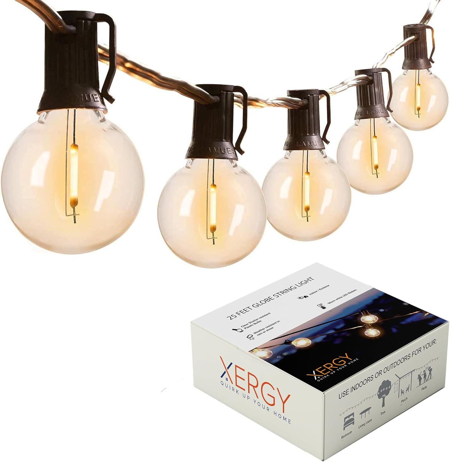 Products Features & Package List Products Features: ▸ Listed for Indoor & Outdoor Use even in bad weather. A nice decoration for your garden, patio, lawn,Christmas tree,party,wedding,etc ▸These garden lights can create a charming and cosy atmosphere which make people enjoying the happiness of a party Package List: ▸ 1x G40 Outdoor String Lights ▸ 1x User Manual
