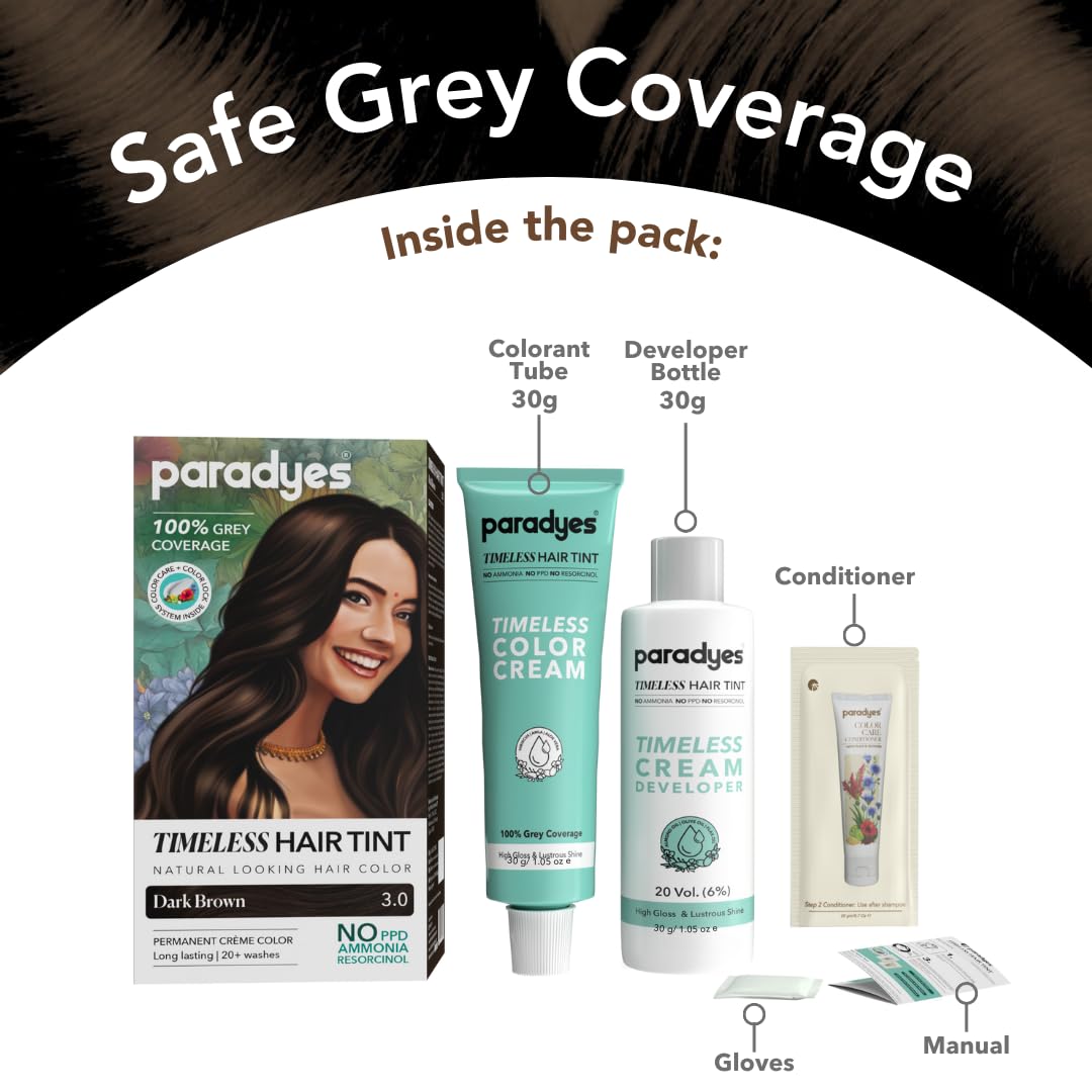 Paradyes Mini Dark Brown Timeless Hair Tint, Permanent Crème Hair Colour for Natural-Looking Results, Complete Grey Coverage, Formula Free from PPD, Ammonia, & Resorcinol, 3.0 Dark Brown