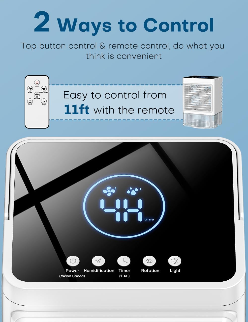 📱【𝟏𝟏𝐅𝐓 𝐑𝐞𝐦𝐨𝐭𝐞 𝐂𝐨𝐧𝐭𝐫𝐨𝐥 & 𝐋𝐄𝐃 𝐒𝐜𝐫𝐞𝐞𝐧】This evaporative air cooler features clear LED panel with button controls, which can be easily operated by the elderly and children. It also comes with a remote control, allowing you to switch between functions from up to 11 ft away. Imagine you are lying on the sofa reading a book, just press the remote control to adjust, no need to get up to adjust the settings. Say goodbye to hassle and hello a more convenient and comfortable summer.