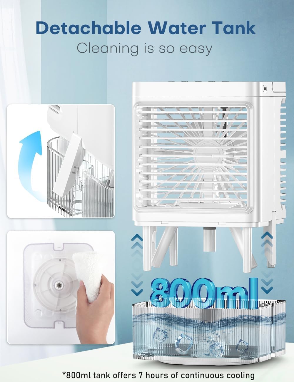 👍【𝟖𝟎𝟎𝐌𝐋 𝐃𝐞𝐭𝐚𝐜𝐡𝐚𝐛𝐥𝐞 𝐓𝐚𝐧𝐤 𝐟𝐨𝐫 𝟕𝐇 𝐂𝐨𝐨𝐥𝐢𝐧𝐠】With the innovative detachable tank design, it is easy to refill and keep clean. Equipped with an 800ml water tank, the air cooler for room can run continuously for up to 7 hours in low-speed mode, ensuring uninterrupted cooling (Actual running time may vary based on ambient temp). Plus, the included ice tray provides extra cooling power. Just fill the tray with water and freeze, then add the ice cubes into the water tank.