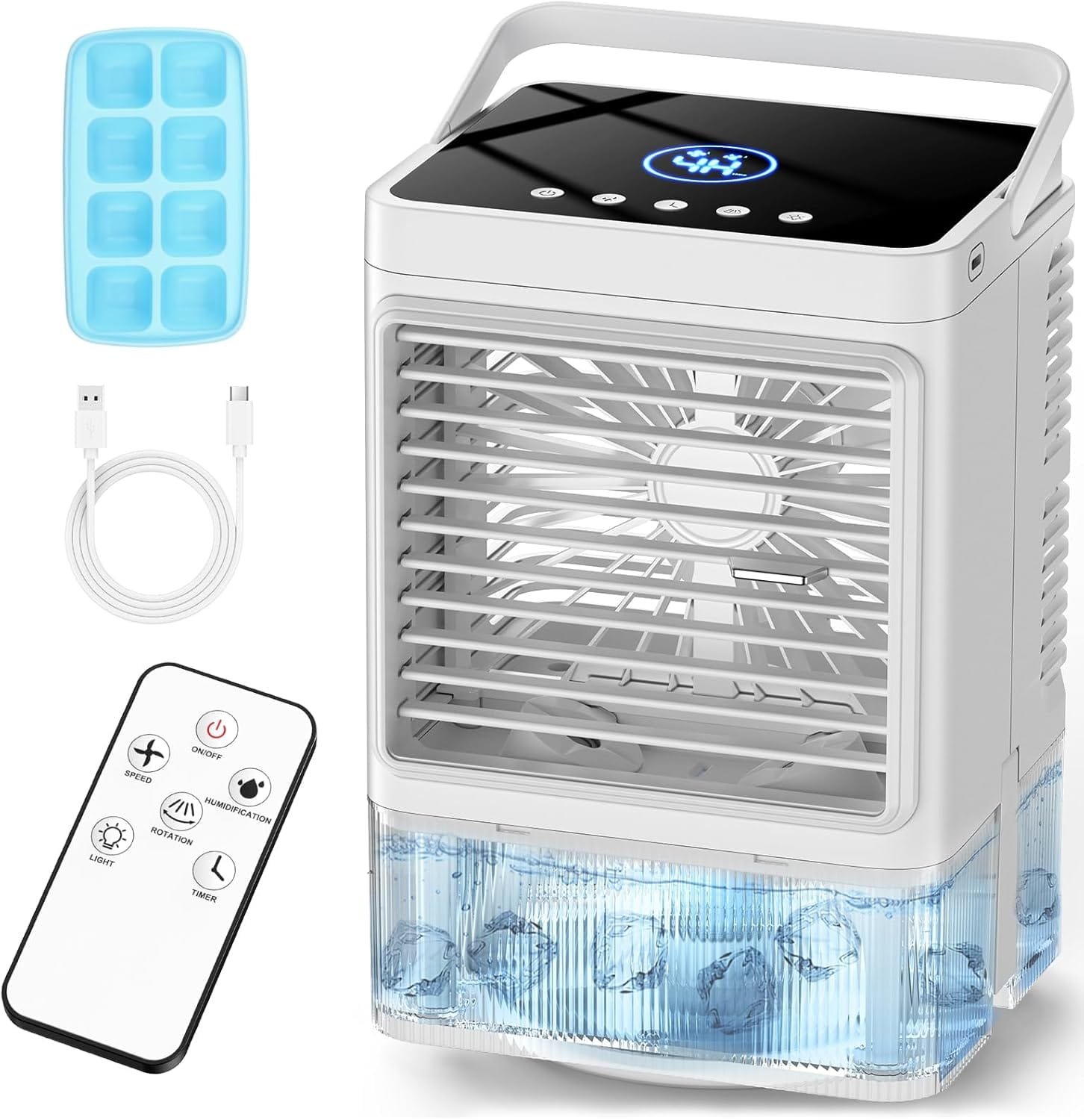 🎁【𝐖𝐡𝐚𝐭 𝐘𝐨𝐮 𝐖𝐢𝐥𝐥 𝐆𝐞𝐭】Package List: 1 x swamp cooler air conditioner; 1 x 8-cube Ice Tray; 1x Remote Control; 1 x 5.9ft USB Cable (2A); 1x User Manual. If you have any questions about the cooler, you can contact us at any time via Amazon or the instructions in the manual, and we will reply to you within 24 hours. ( Upon delivery, open the water tank first and take out the accessories to use.)