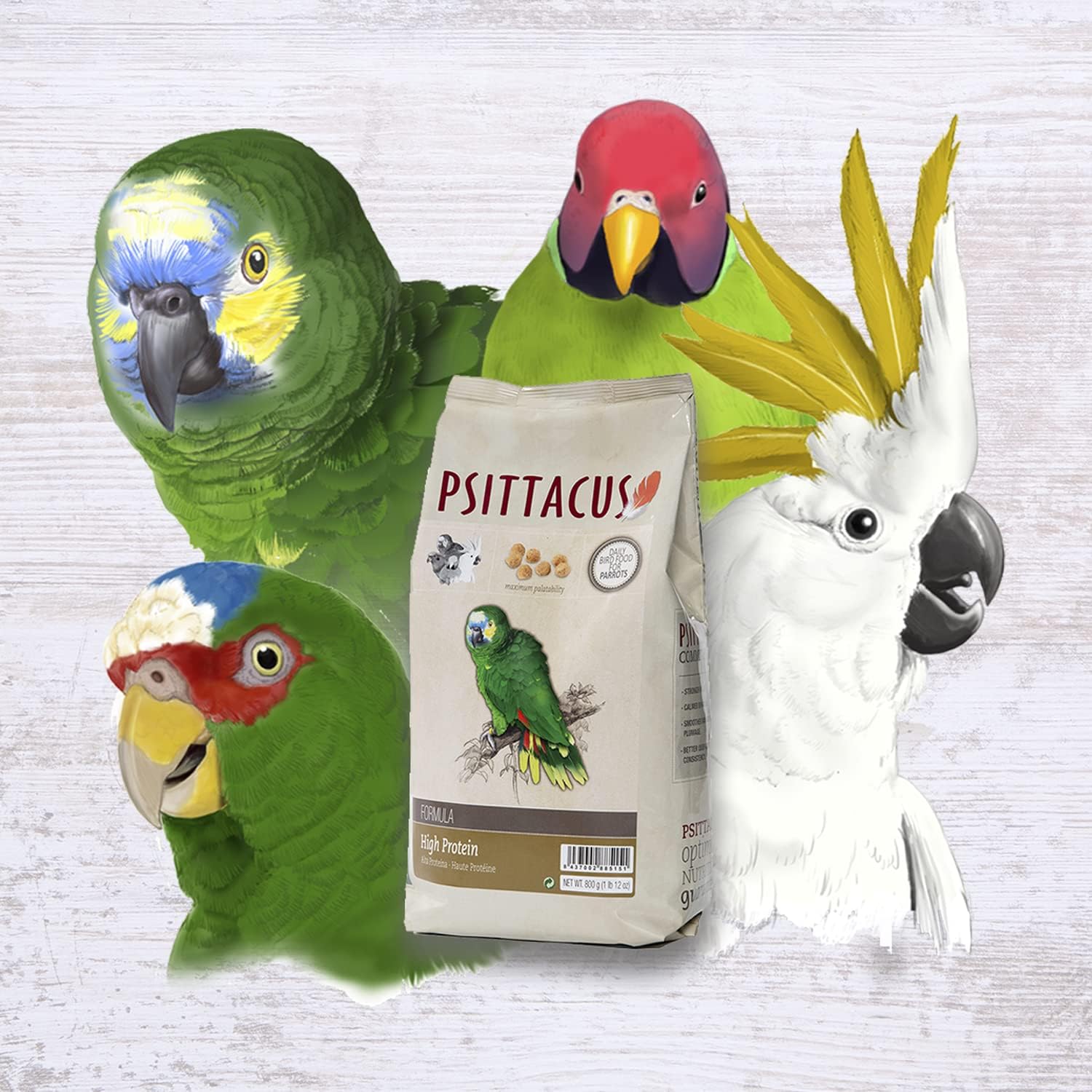 PSITTACUS HIGH PROTEIN: It is an extruded pellet designed for species that in nature consume a wide variety of fruits and seeds with low to moderate fat content such as Amazons, cockatoos and ringneck parakeet. It’s suitable for young and adult birds. It comes in a 800 g package.