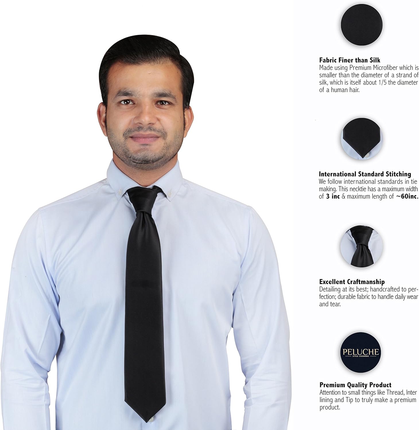 Everyone will admire your impressive sense of style when you wear this black colored necktie by Peluche. This handmade tie is fabricated using the international standard of stitching with high quality microfiber, which is long lasting. Furthermore, it features an attractive solid pattern and flawless finish. It is packed in a chic box before delivering it to your doorstep. Peluche exhibits an excellent craftsmanship and believes in zero compromise in the quality of its products.
