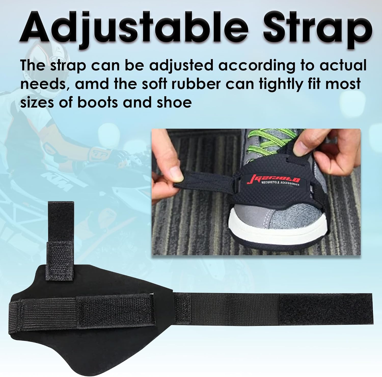 PREMIUM MANUFACTURING: This gear shift protector is made of wear-resistant silicon rubber along with an adjustable strap to ensure a snug fit to the most size of boots and shoes.