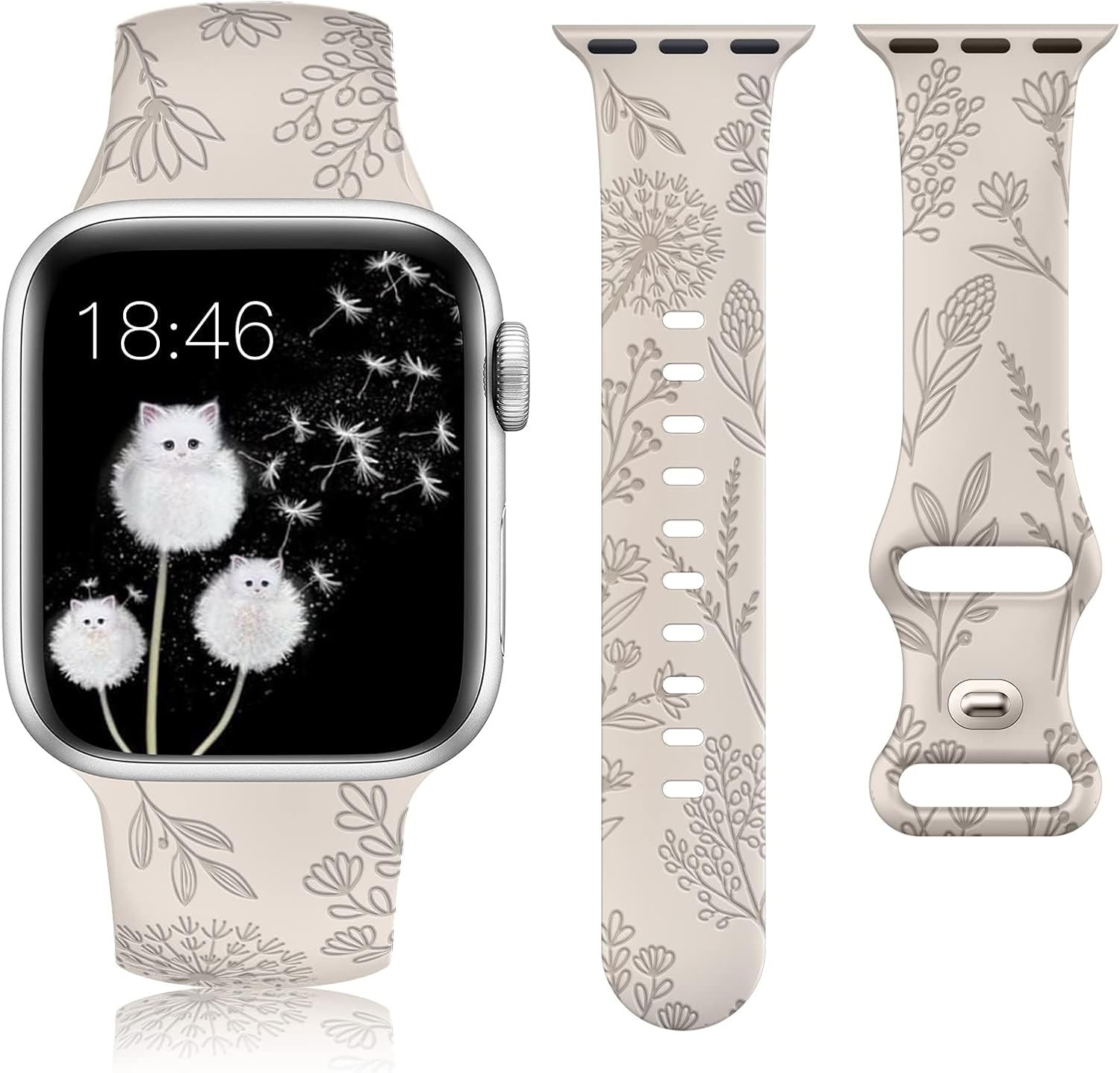 【Quality Material】 Made of high-performance silicone, this apple watch band not only delivers smooth and soft finish for bringing you comfortable wearing experience but also offers outstanding durability. Utilizing advanced laser engraving, our iwatch silicone band comes with a variety of floral and dandelion patterns in high definition. It does not wear off and fades over time, giving you a lightweight, flexible, and energetic feeling.