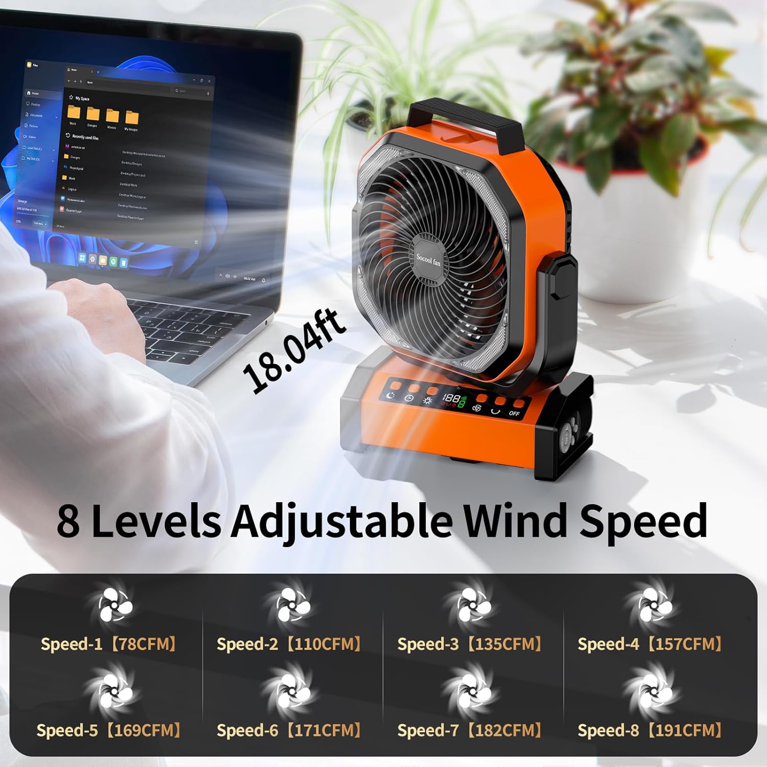 【8 Levels Powerful Wind Adjustable】 Camping fan has a high-speed brushless motor with a maximum speed of up to 1970RPM and blows strong airflow for rapid cooling. With 8-gear and adjustable wind speeds ranging from natural breeze to strong wind, this rechargeable camping fan meets all your needs whether for home office or outdoor camping