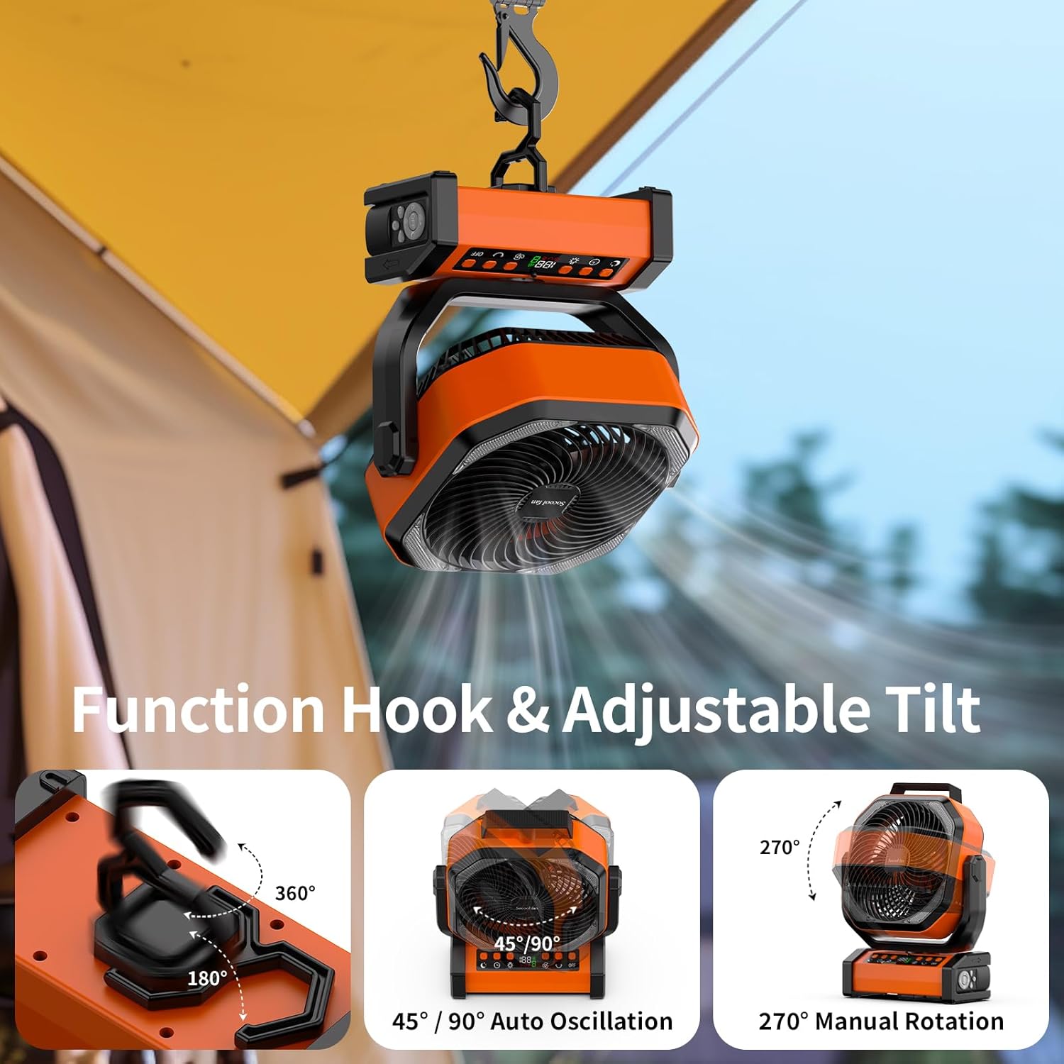 【Auto Oscillation & Hanging Hook】Table fan featuring 45° / 90° auto oscillation and 270° manual upside-down pivoting function blows strong airflow from different directions instead of straight wind. A hidden hanging hook design at the bottom, supporting 360° rotation and 180° flip, space-saving and effortless hanging from a variety of structures such as tents, umbrellas, and hammocks