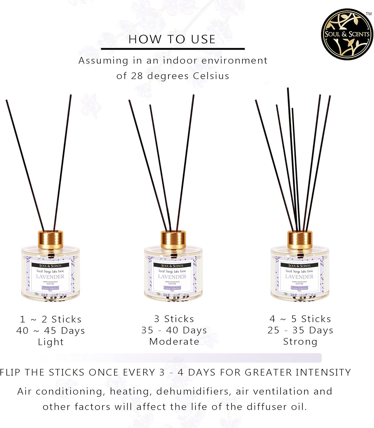 Easy to Use – Remove the cap of the bottle and plastic plug and keep it in up right position. Insert the reed sticks into the bottle. Increase or decrease the reed stick quantity to adjust fragrance.
