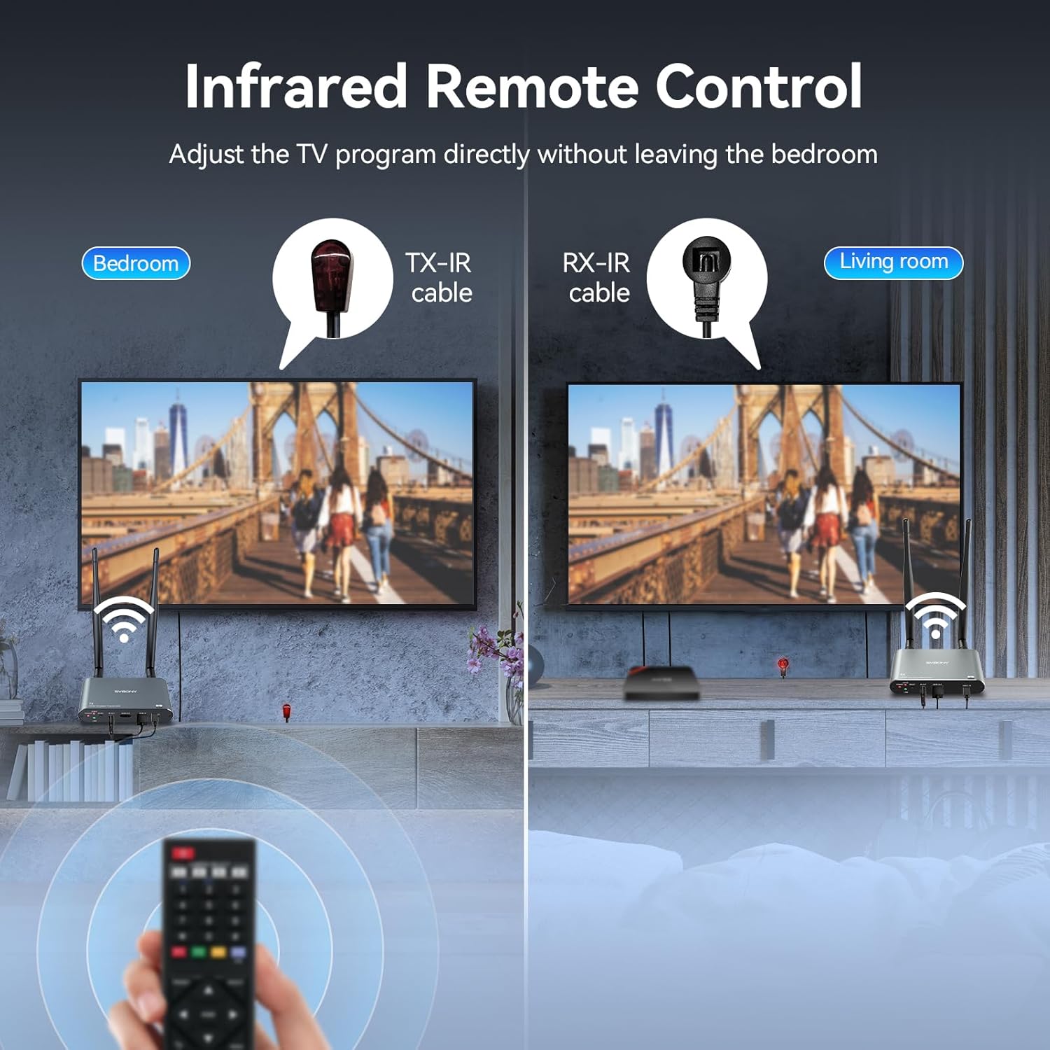 Infrared remote control: get rid of the cable trouble; long-distance HDMI wireless transmitter and receiver control the source devices conveniently; when you are in different rooms
