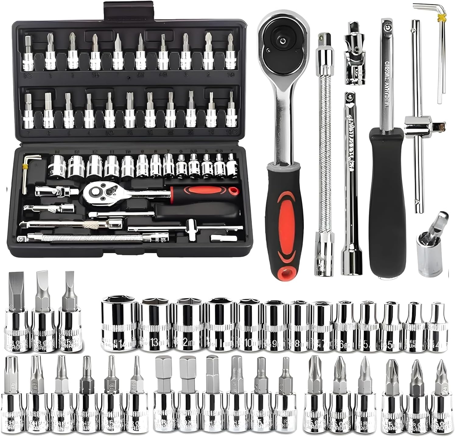 What’s in the box: 46-Piece Tool Set Includes: 13pcs 1/4″ drive sockets (4-14mm), 21pcs drive bit sockets (PH/PZ/FD/HW/T sizes), U-Joint, Flexible Extension Bar, Spinner Handle, 2-inch and 4-inch Extension Rods, Sliding T-Bar, 72T Ratchet Handle, 3pcs Hex Key Wrenches (1.25-2.5mm), Slotted Bits (4mm, 5.5mm, 7mm), 2pcs 1/4″ drive extension bars, 1pc quick ratchet, 1pc universal joint, 1pc sliding bar, 1pc soft flexible extension, all stored in a durable blow case for easy storage and portability.
