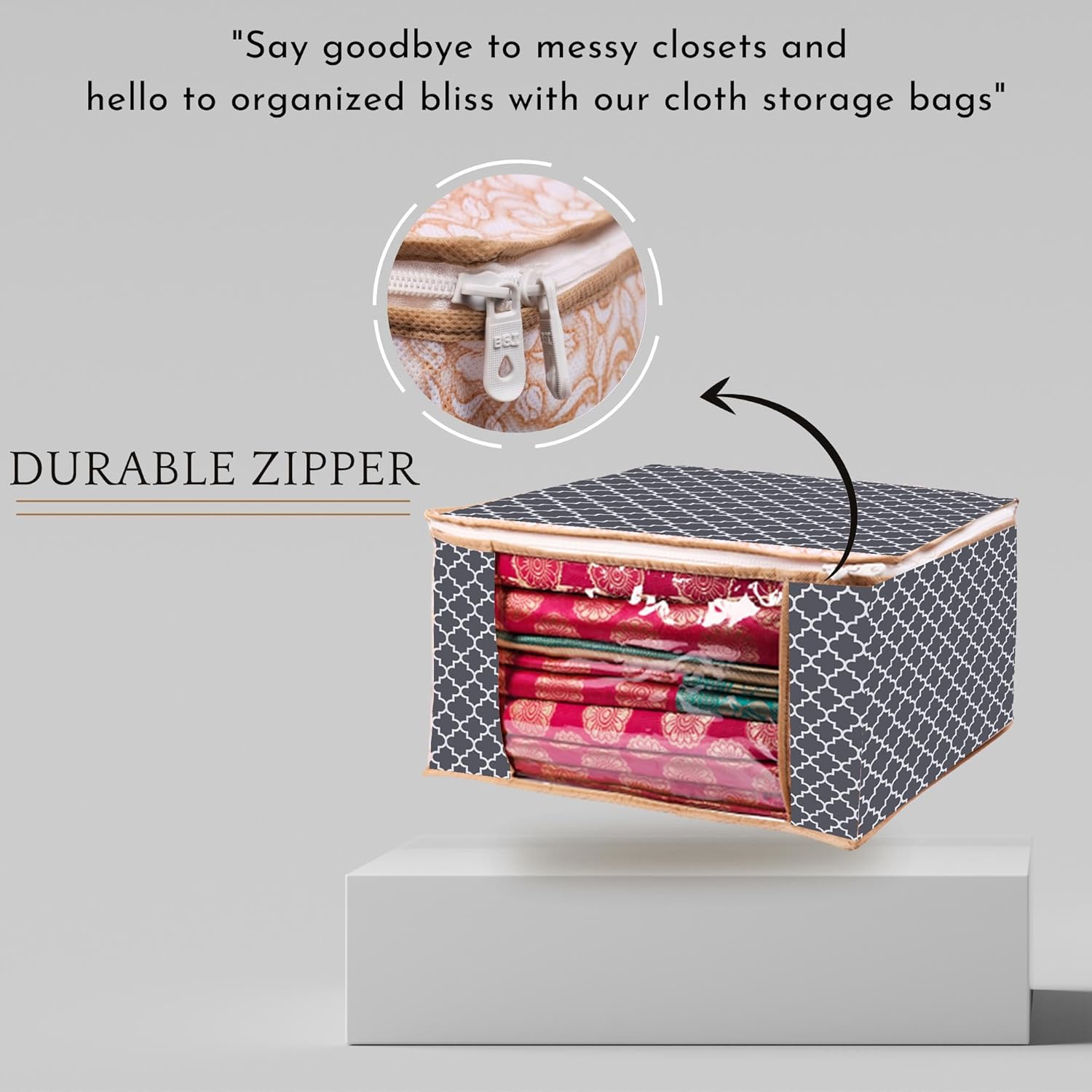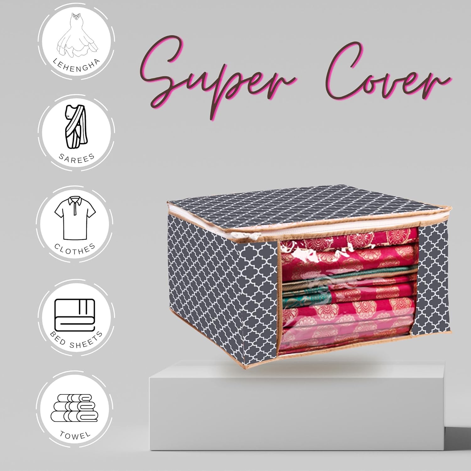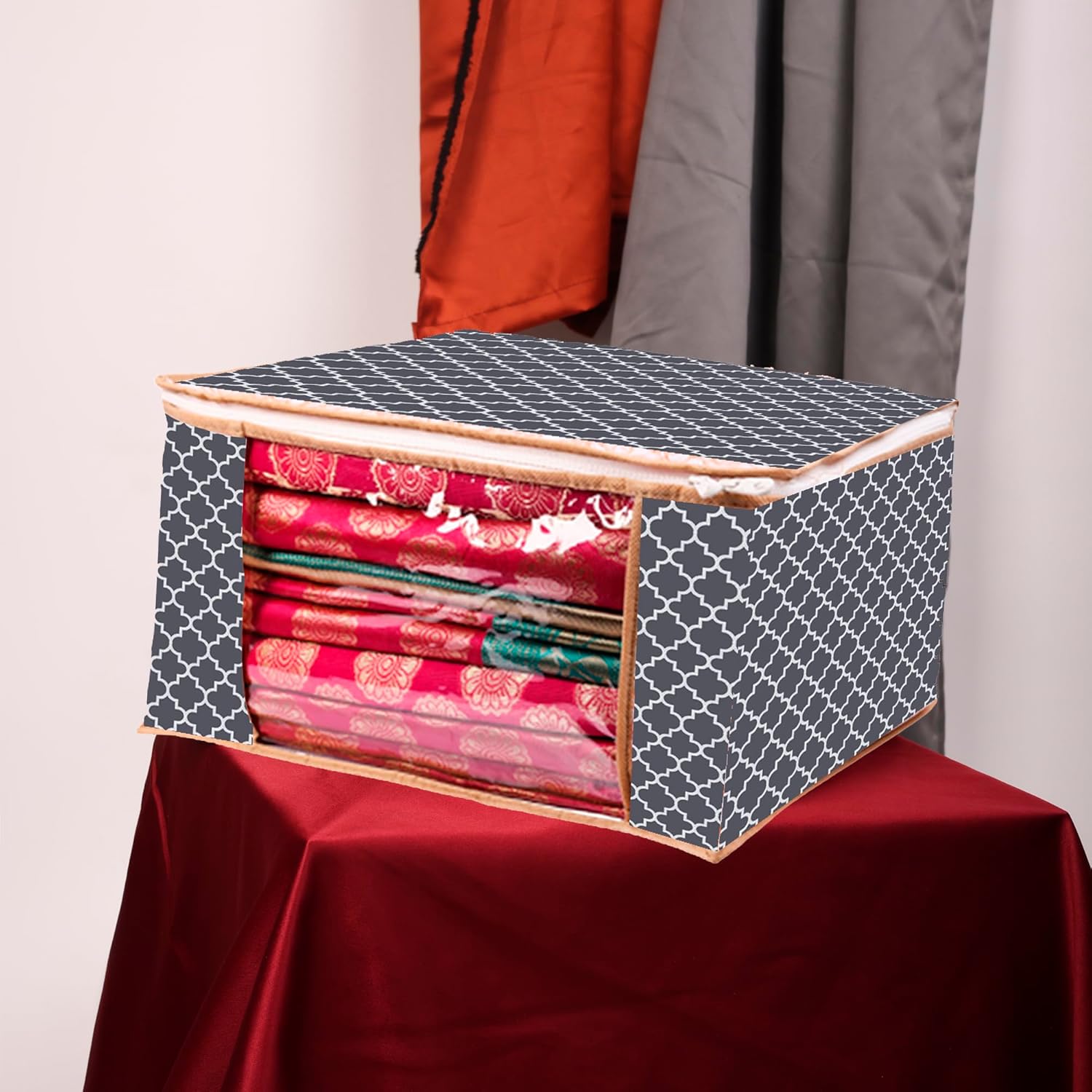 Large Size: Each bag size is 43 x 35 x 22 cm. It is suitable to store Saree, Lehengha, Shuit, Dress.