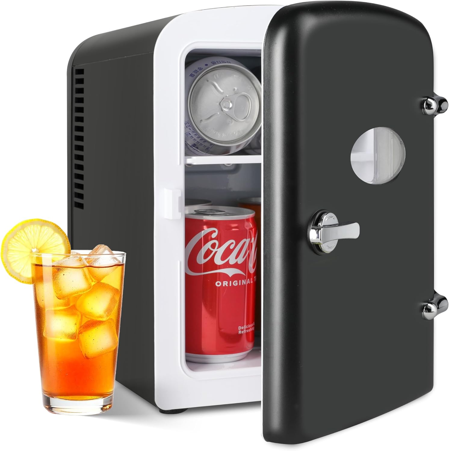 YSSOA 4L/6 Can Portable Mini Fridge with Observation Window, Compact Cooler & Warmer Freon-Free Small Refrigerator, for Skincare, Beverage, Food, Cosmetics, Black