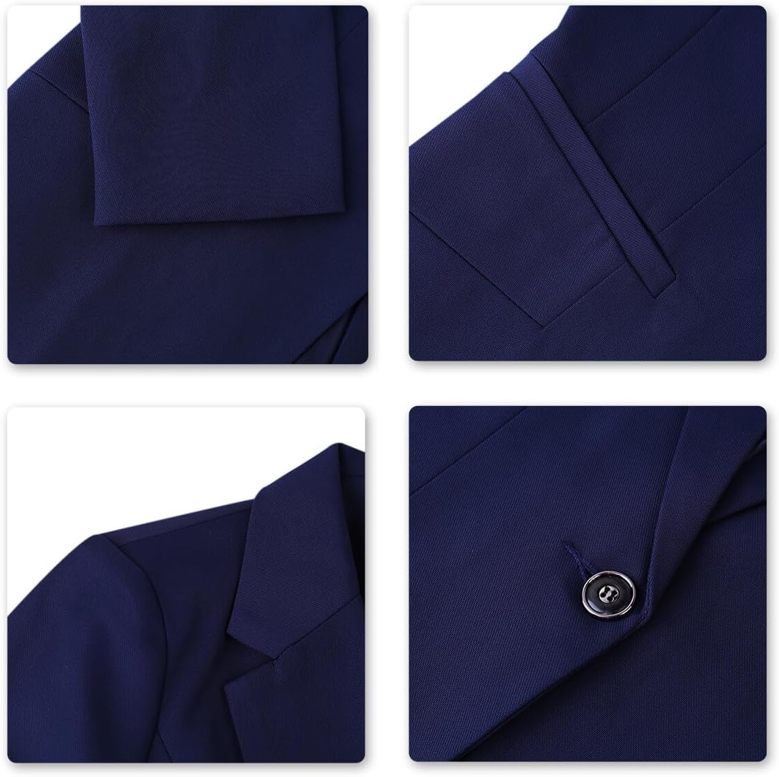 The suit set includes one blazer and suit pants. The blazer feature two buttons closure, notched lapel, long sleeve, two flap pockets; The suit pants feature button and zipper closure, elastic waist